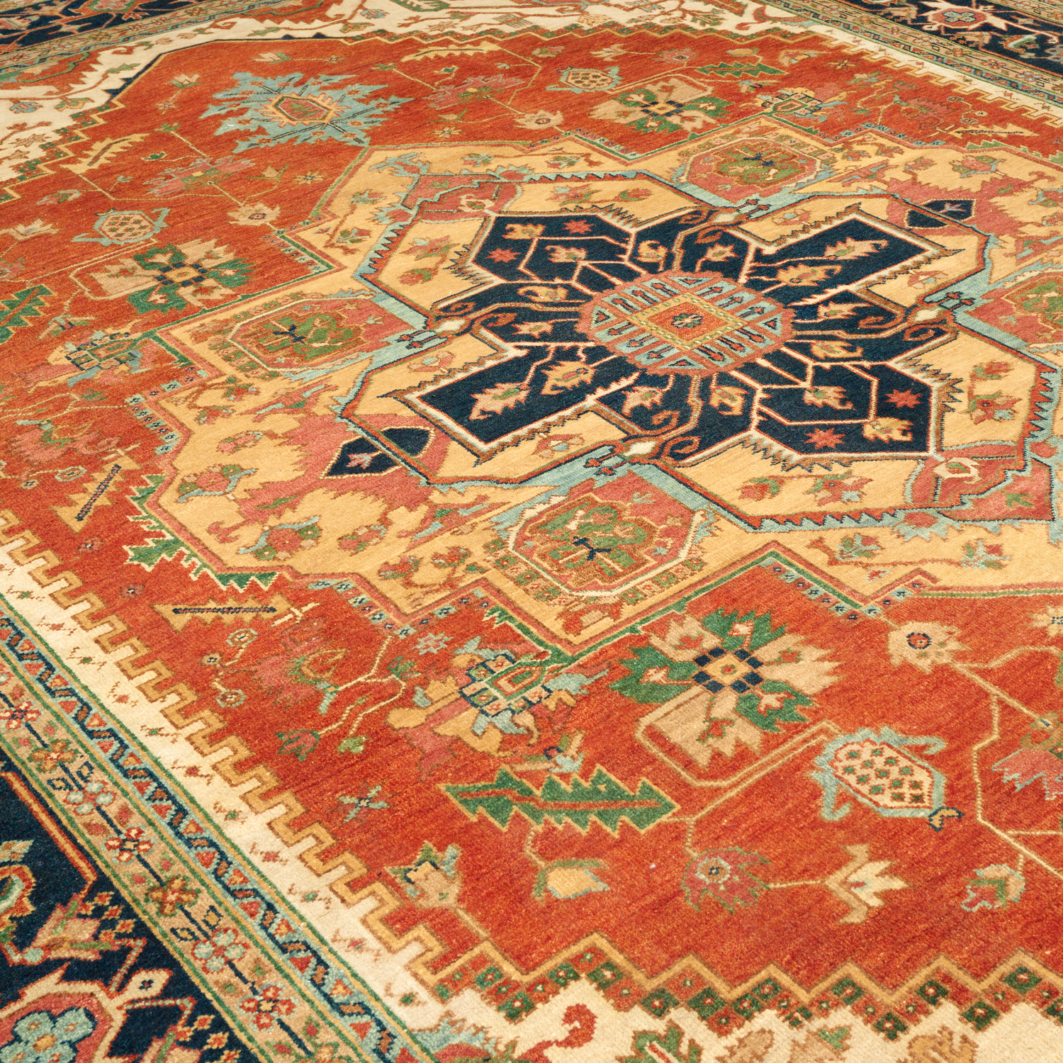 HAND-SPUN WOOLLEN PILE WITH NATURAL DYES. HAND-KNOTTED WEAVE WITH TRADITIONAL HERIZ DESIGN OF A DOMINANT BOLD ANGULAR MEDALLION IN A FIELD OF BOLD PALMETTES AND OAK LEAVES. BORDER OF HERATI MOTIFS AND ROSETTES. THE ENTIRE IN HUES OF MADDER, INDIGO, BLUE, CREAM & BEIGE. GALLERY EXHIBITED.