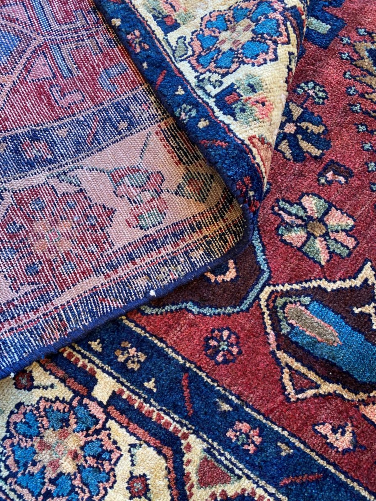 WOOL PILE. HAND-WOVEN VILLAGE WEAVE FROM THE HAMADAN REGION WITH TRIBAL DESIGN OF DOUBLE HEXAGONAL MEDALLIONS CONTAINING FLORAL SPRAYS IN A MADDER-TONED FIELD OF BOLD PALMETTES & FLOWER HEADS. BORDER OF ROSETTES.