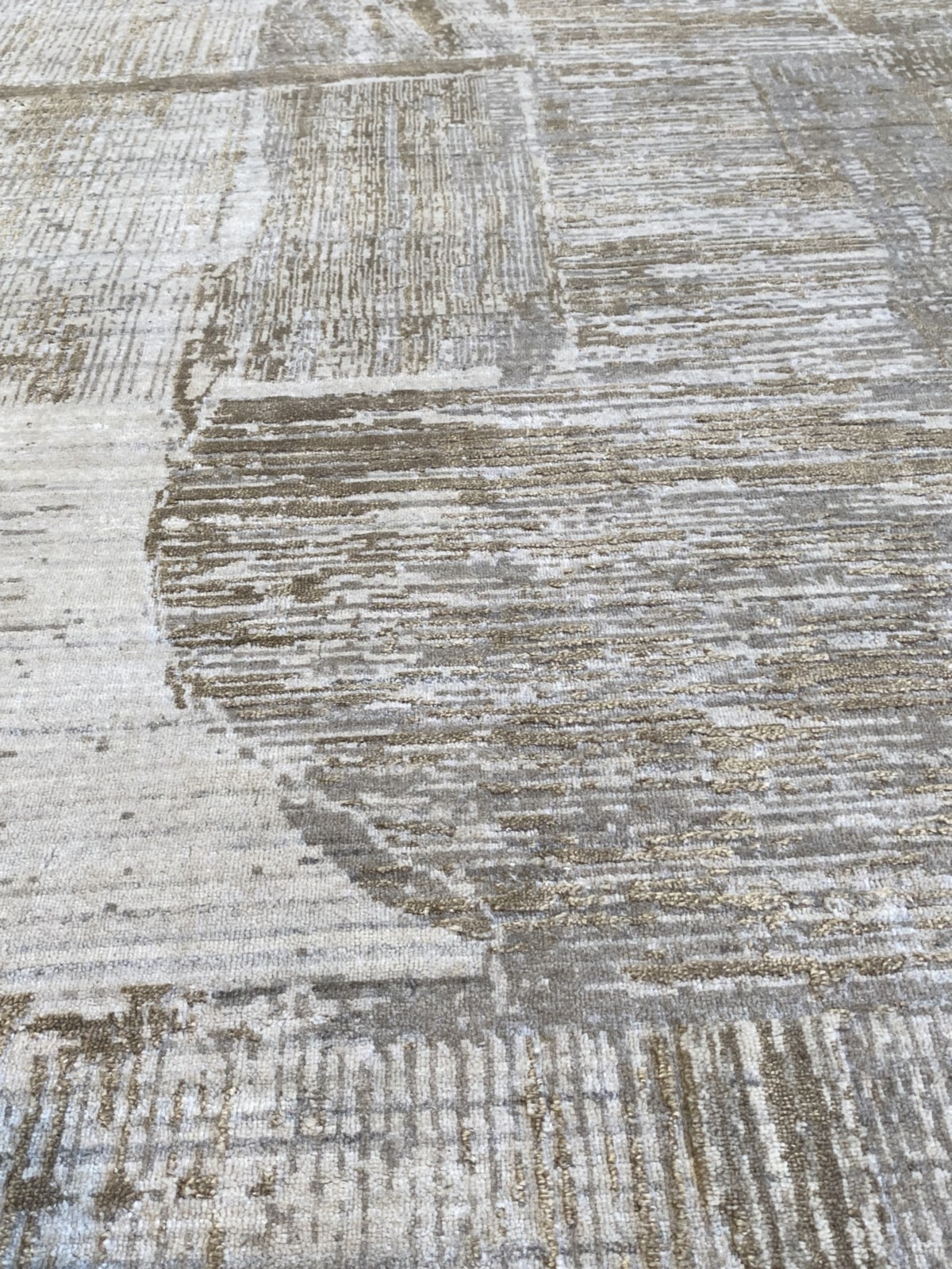 WOOL & BAMBOO SILK FIBRES WITH MODERN DESIGN OF GLACIER DISTRESSED LOOK WITH HAND EMBOSSED PILE LINEAR PATTERNS. THE ENTIRE IN SHADES OF CREAM, LIGHT GREY & CARAMEL.