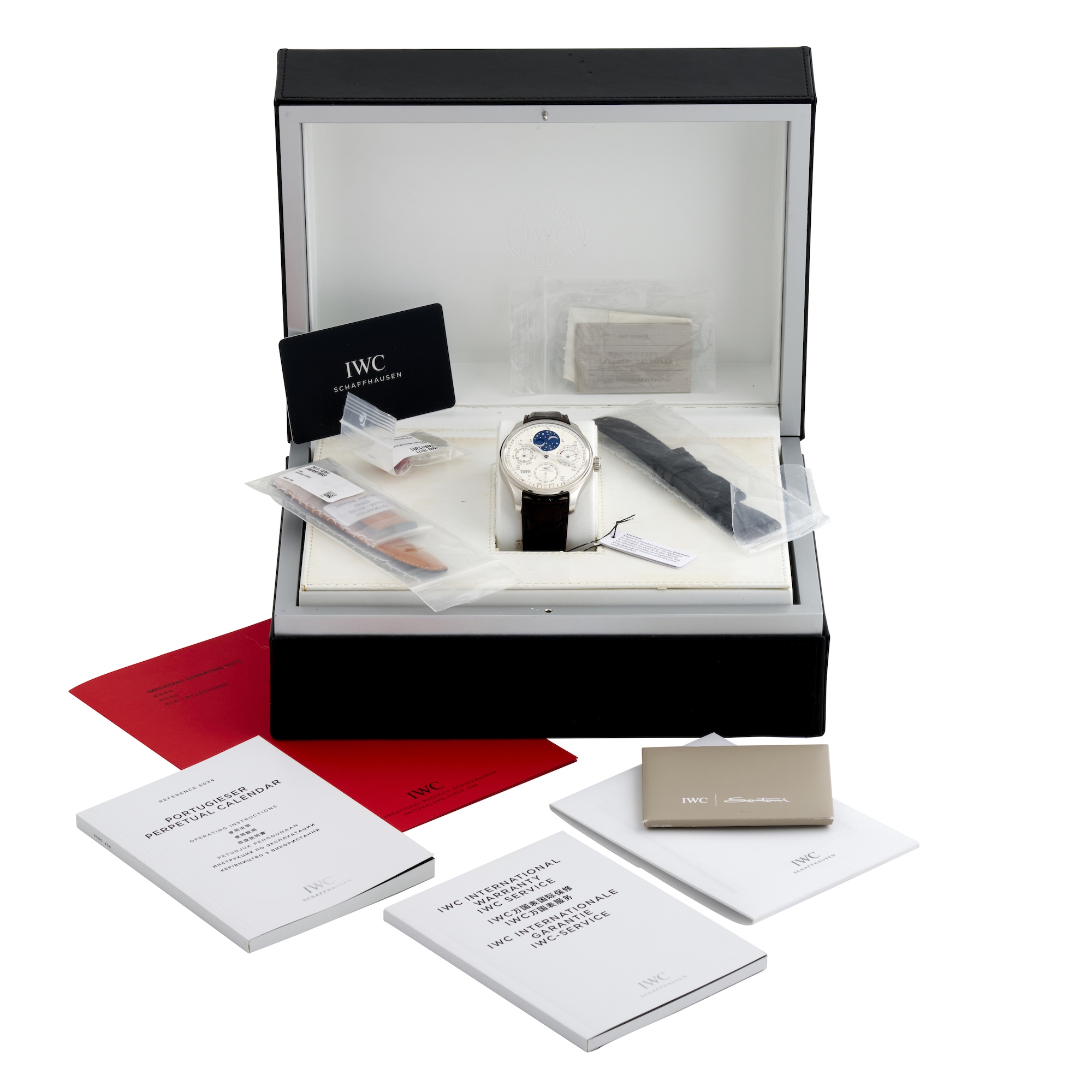 Accessories: IWC international limited warranty card dated 06.08.2019, metal plaque, operating instructions and international warranty service booklets, polishing cloth, century indictation slide, black leather and textile straps and presentation box