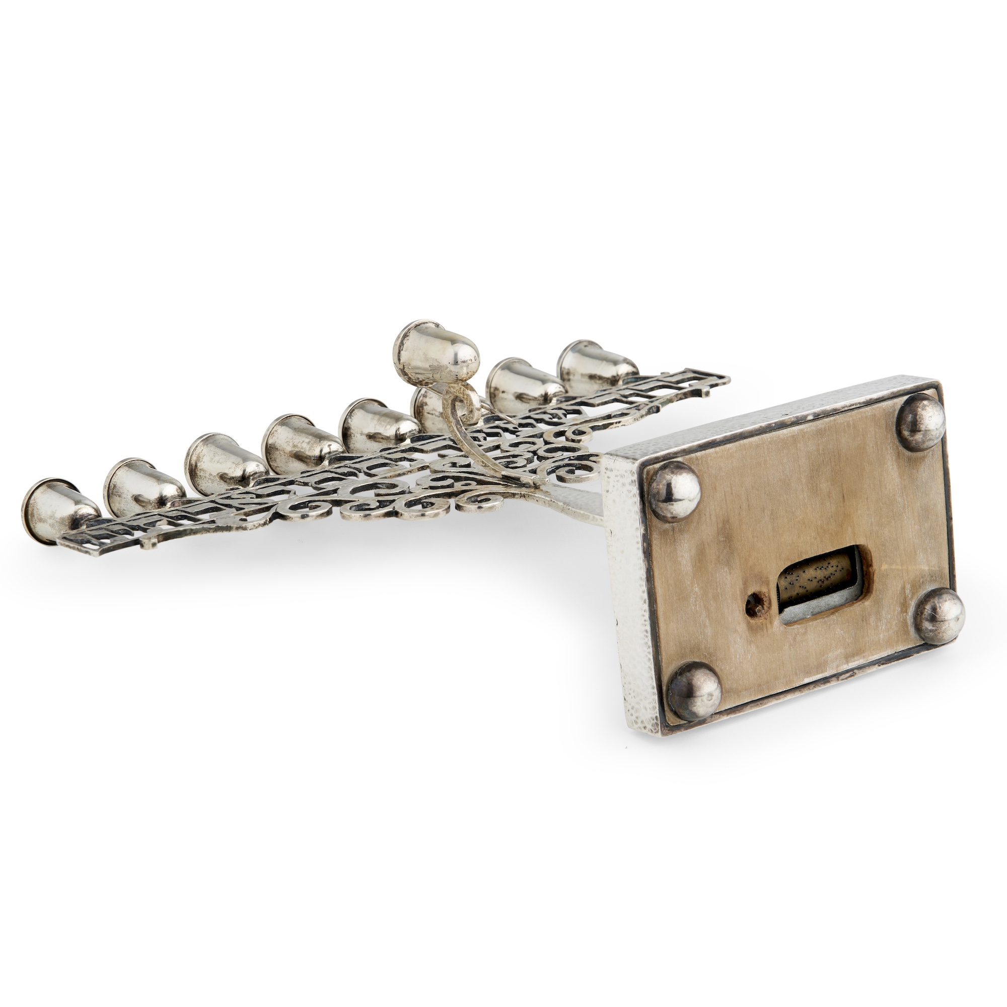 In the flat stylised form of a tree on a spreading rectangular base, the eight lights arranged in a line above an openwork inscription in Hebrew and the shamash mounted to the front, all but the lights planished, the based accommodating a simple mechanical musical movement