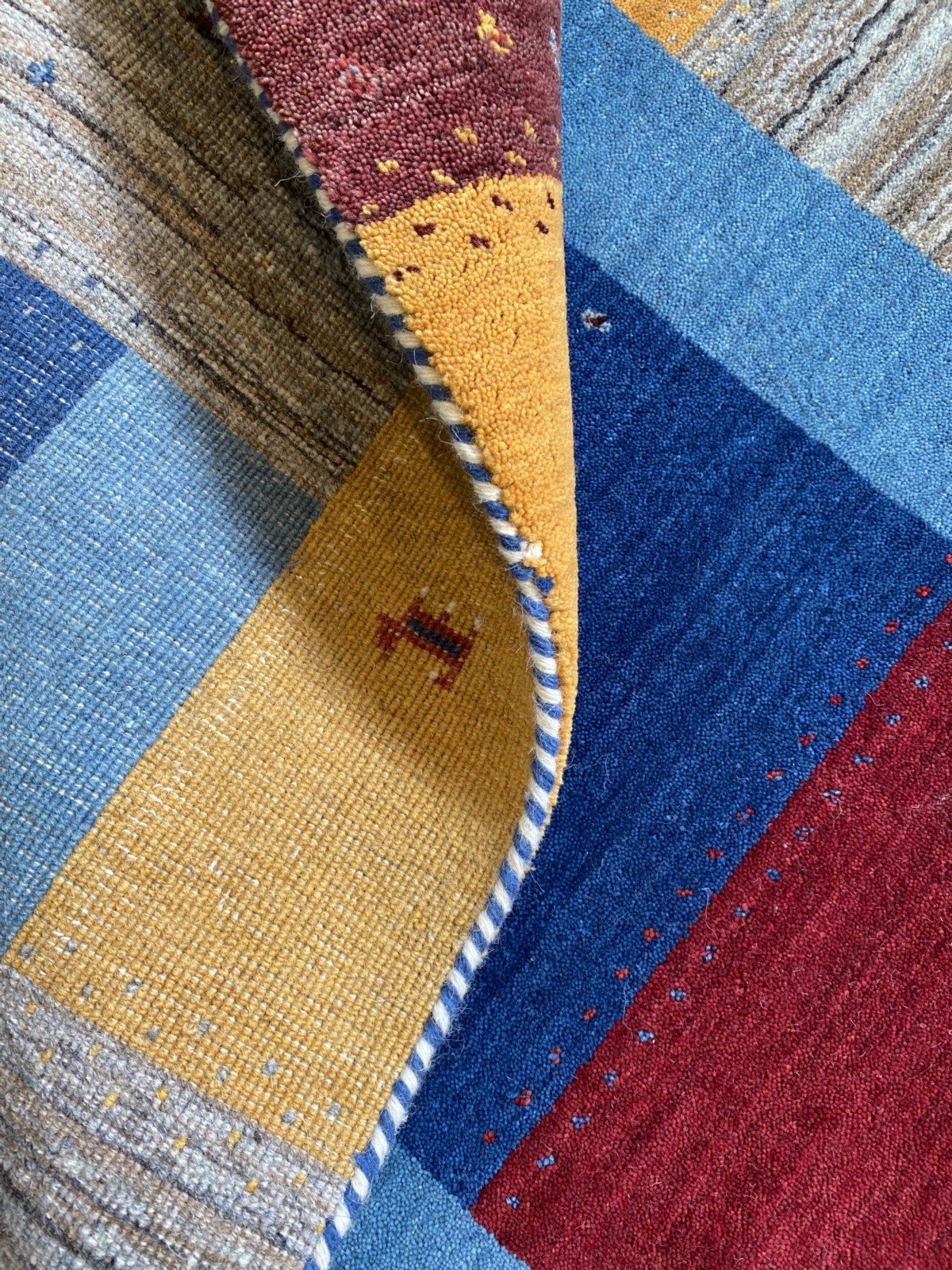 HANDMADE LOOM WEAVE WITH PERSIAN NOMADIC DESIGN OF INTRICATE GOAT & TREE OF LIFE PATTERNS IN A COLOURFUL PANELLED FIELD.