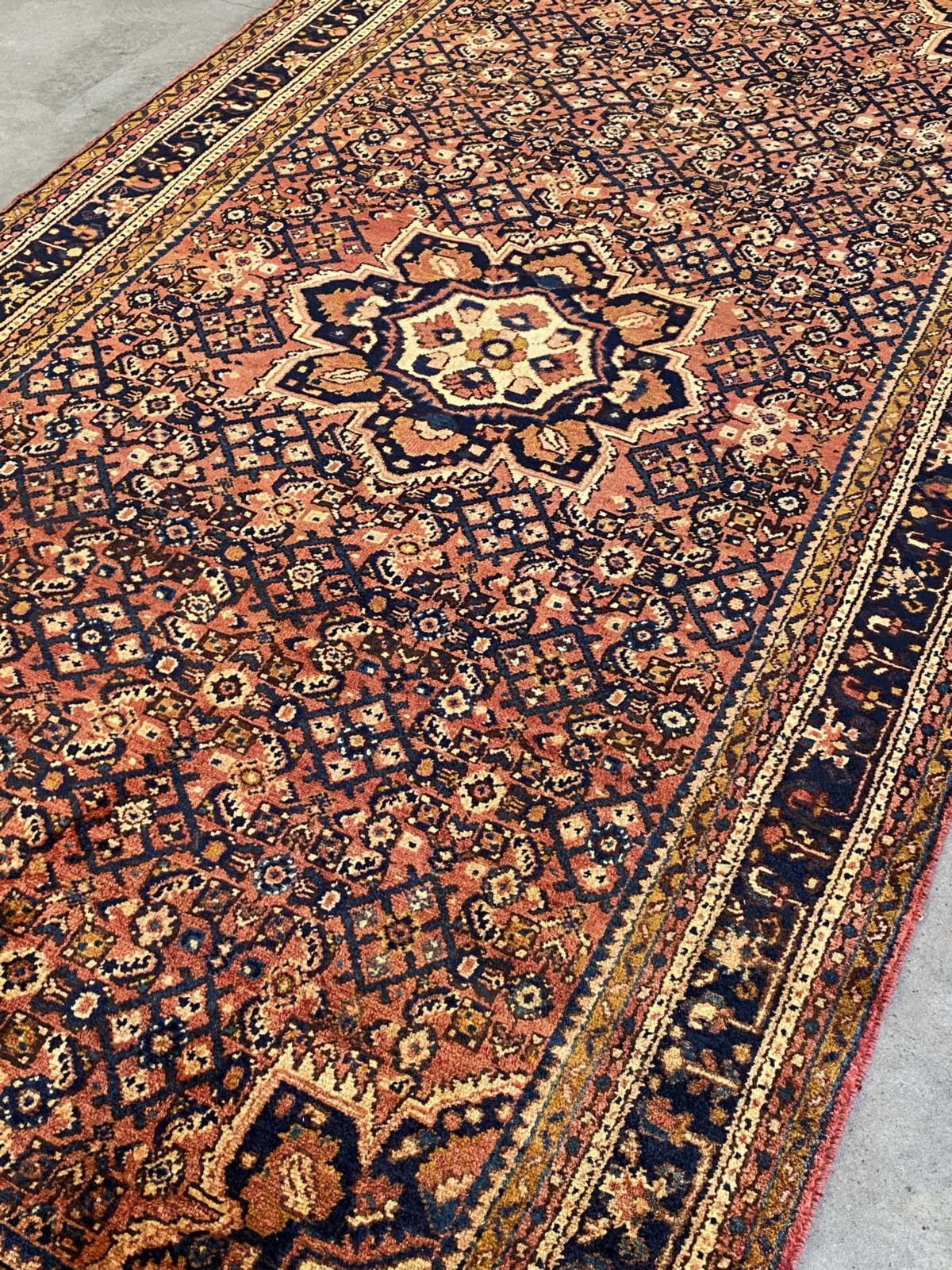 HAND-KNOTTED VILLAGE WEAVE FROM THE HAMADAN PROVINCE WITH TRIBAL DESIGN OF CENTRAL FLORAL MEDALLION IN A FIELD OF BOLD HERATI MAHI PATTERNS.