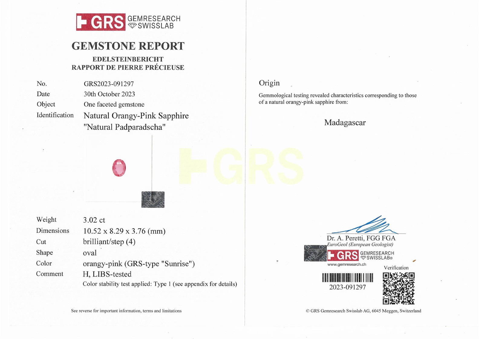 a GRS report numbered GRS2023-091297, dated 30 October 2023 stating that the 3.02 carat Padparadscha sapphire is natural, orangy-pink colour, with indications of heating, of Madagascan origin;