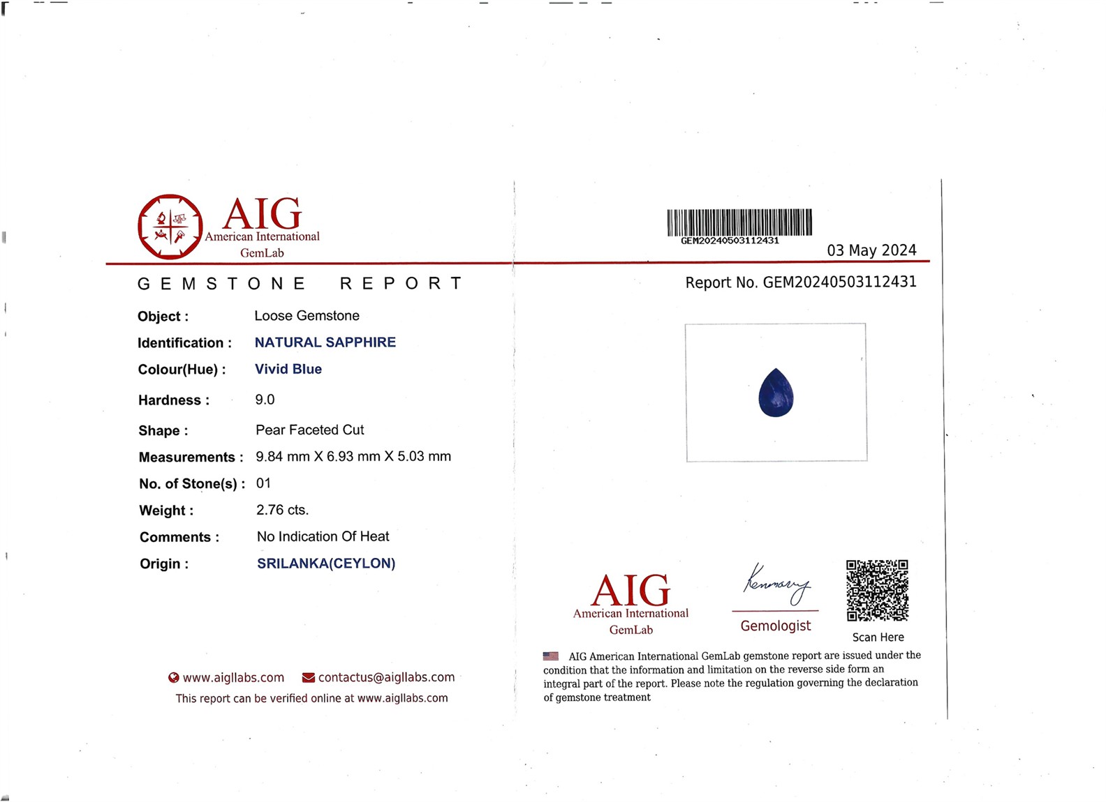 Accompanied by a fascimile AIG report numbered GEM20240503112431 dated 3 May 2024, stating that the 2.76 carat sapphire is natural, with no indications of hear, of Sri Lankan origin.