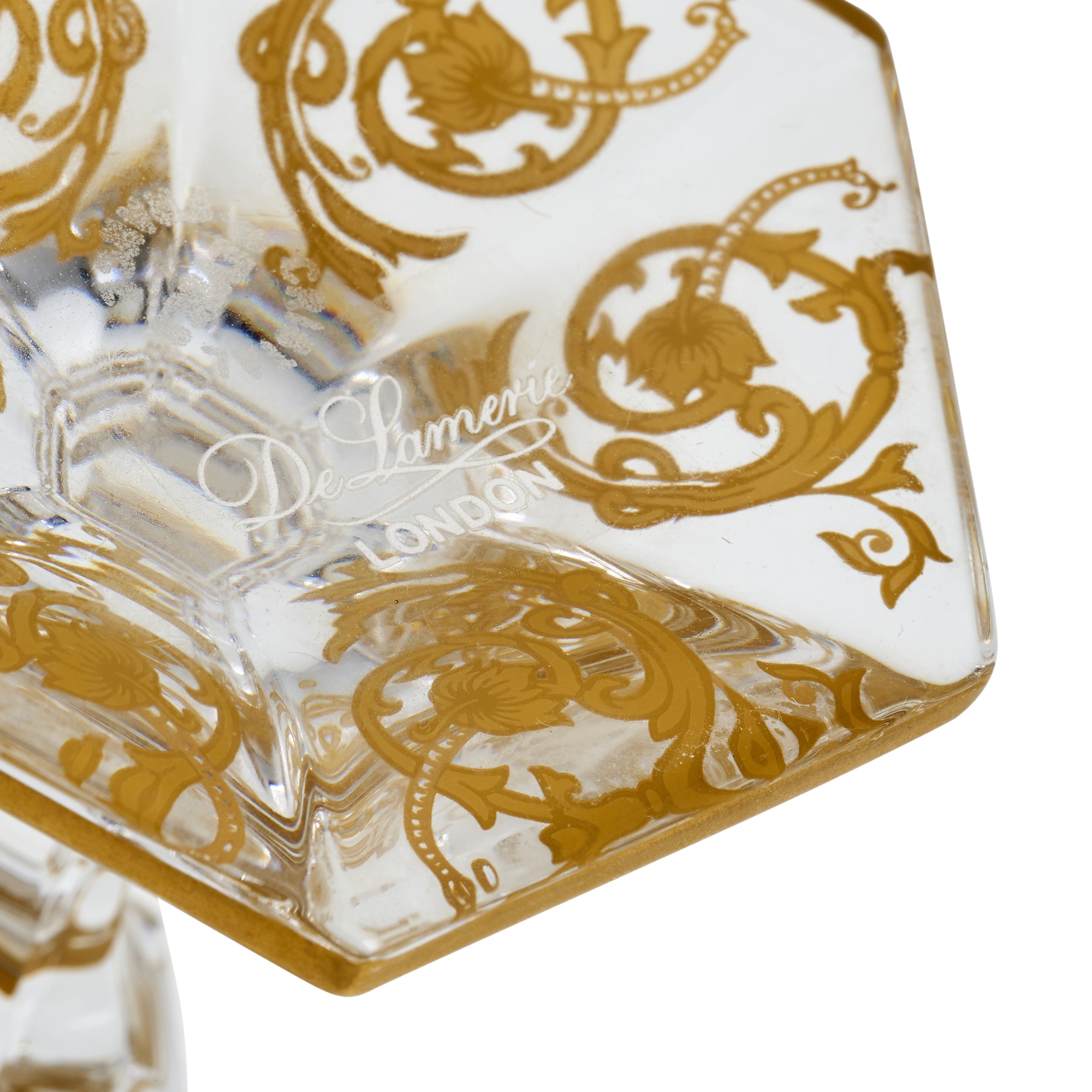 In De Lamerie's 'Robert Adam' pattern with the Neo-Classical gilt decoration on clear crystal, ninety-six pieces, comprising twelve each of champagne coupes and flutes, glasses for white wine, red wine, dessert wine, and liqueur, and highball glasses, together one or two additional glasses of most types, a decanter and a pitcher, each of hexagonal outline in faceting and feet