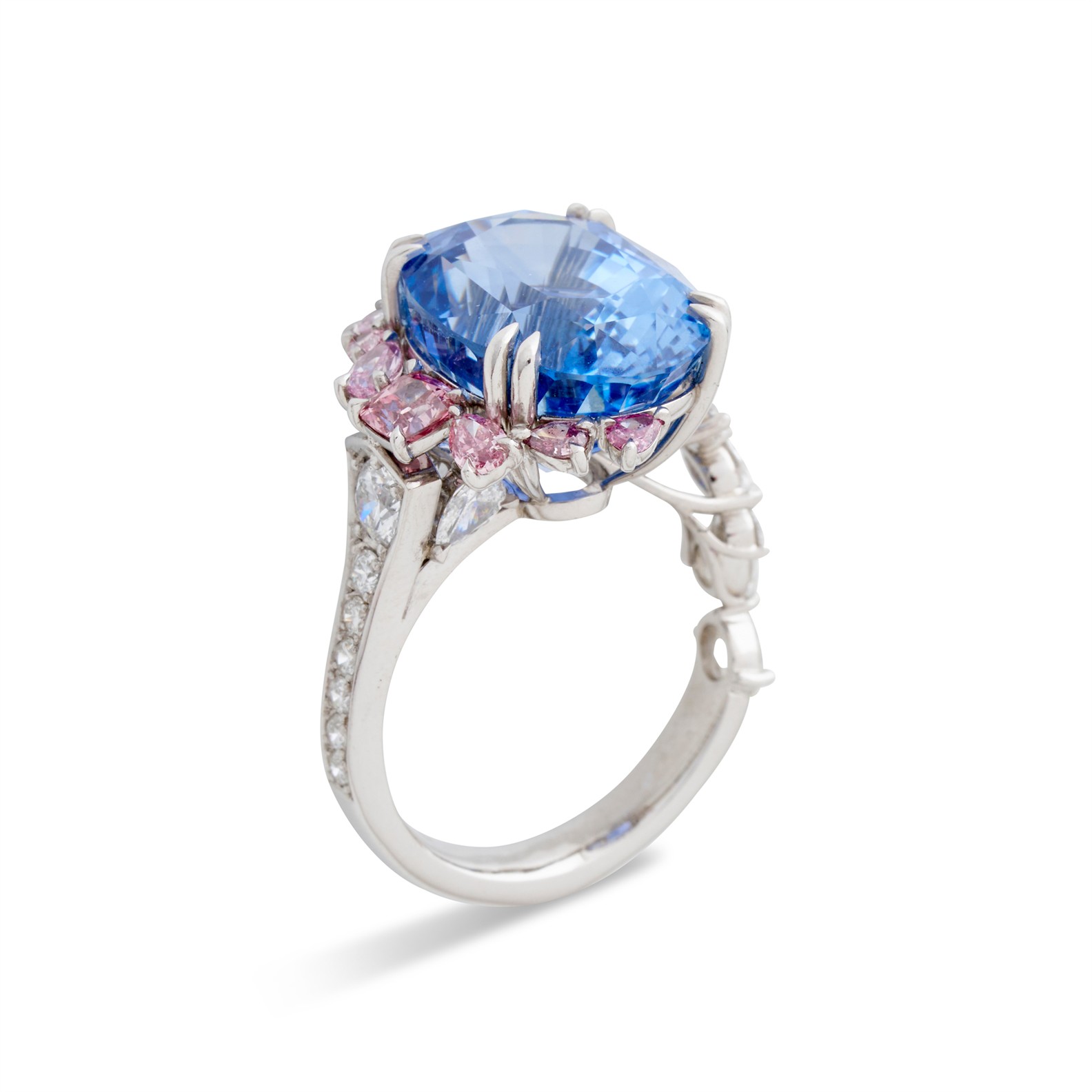 Centring a claw-set oval sapphire weighing 17.94 carats, to a shoulder set with a 0.31 carat cushion-shaped Argyle pink diamond within a surround of mixed-cut fancy pink to purple-ish pink coloured diamonds graduating in colour to near-colourless diamonds, the fancy pink and near colourless diamonds together weighing approximately 0.43 carats and 2.34 carats respectivelty, mounted in platinum, size P1/2, gross weight approximately 15.16 grams, maker's mark for Matthew Ely.