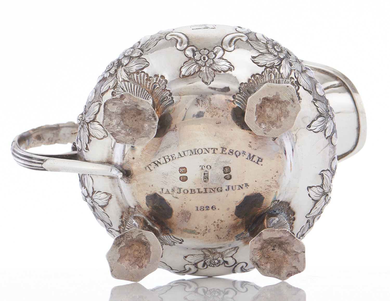 Comprising a teapot, creamer, and sugar bowl, the teapot surmounted with a flower finial, the creamer and sugar bowl with gilt washed interiors, floriate and scroll decoration to all three, all raised upon scroll and shell feet, all three engraved with 'T.W. BEAUMONT ESQR. M.P./JAS. JOBLING JUNR./1826' to base together with hallmarks