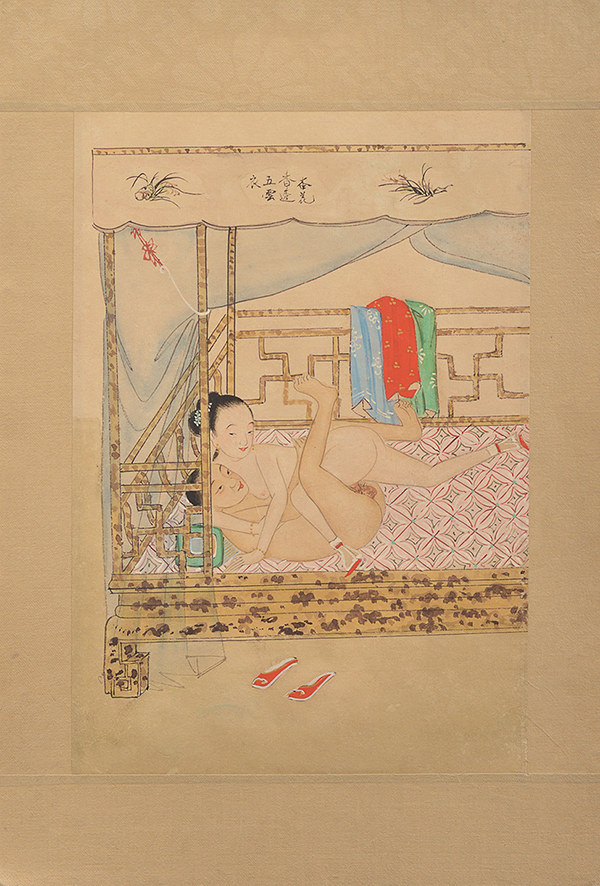 ink and colour on paper with gilt highlights, depicting amorous couples in interiors, at times with other figures watching to the side, the floral arrangements in the background providing subtle double-entendres to the principle scene