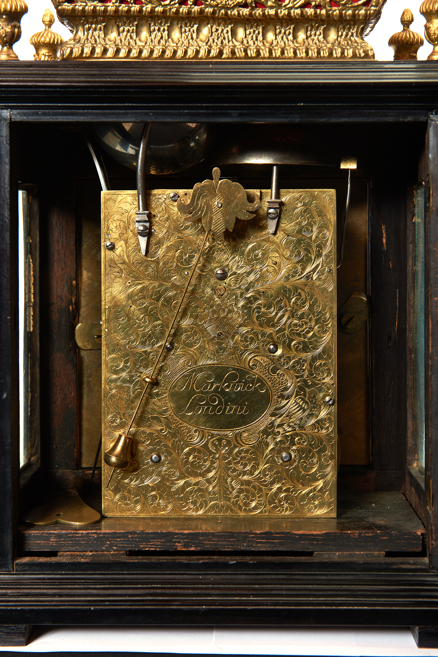 The ebonised case with repousse work to gilt metal double bracket top. The corners mounted with gilded brass urn finials. Cast handles to the sides, above glazed panels. The front door applied with further gilt mounts to all four faces. The moulded base raised on block feet. The square dial with winged cherub spandrels and blue steel hands to silvered Roman and Arabic chapter ring. Calendar aperture and ringed winding holes, the former with engraved border decoration. Eight-day movement with twin fusees, ringed pillars, bob pendulum and verge escapement. Hour striking on bell and pull repeat on six bells. Rectangular brass plate engraved with foliate designs around a central cartouche with Markwick-Londini engraved within.