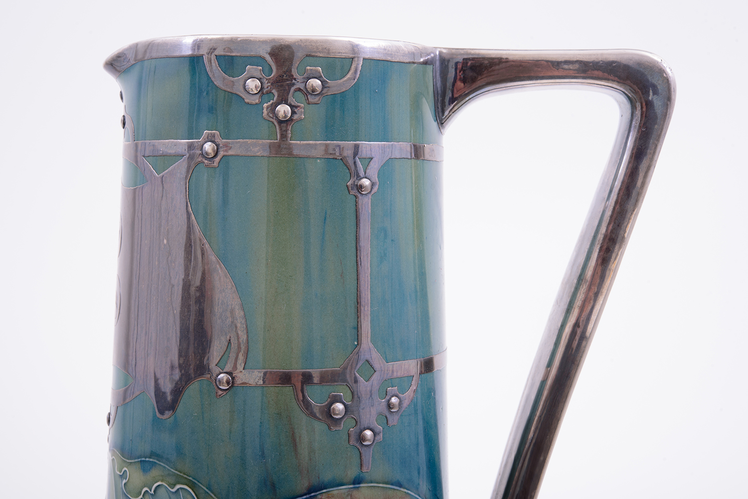 tapering in form, green and midnight blue ground with a repeating toadstool design. The handle, base and upper body are applied with electroplated silver overlay in the Liberty manner, hand signed 'W Moorcroft, Shreve & Company, San Francisco', also stamped with registration number 363 to base. 41cm high