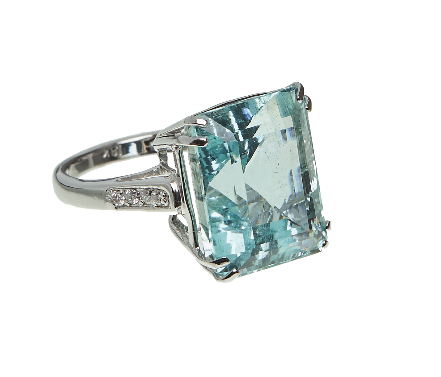 Centrally set with an emerald cut aquamarine weighing 18.20cts and round brilliant cut diamond set shoulders totalling 0.15cts, in 18ct white gold, ring size M.