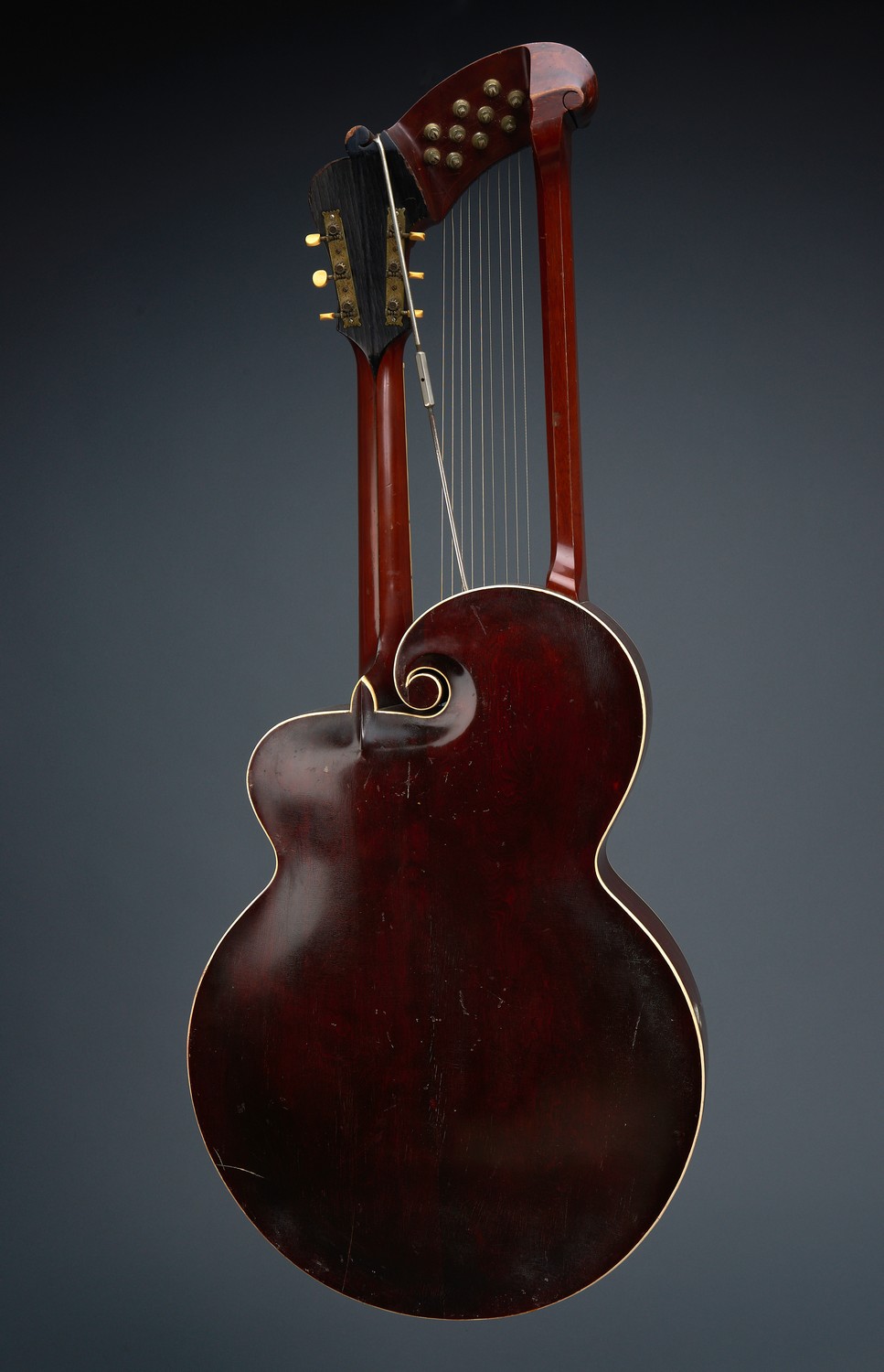 surface scratches overall, replaced bridge with associated faults to varnish bridge pin missing, and not original. break to binding on right hand side of fingerboard. body binding/trim not original- possibly replaced. loss to headstock, stress cracks and structural repair to right hand side of top.