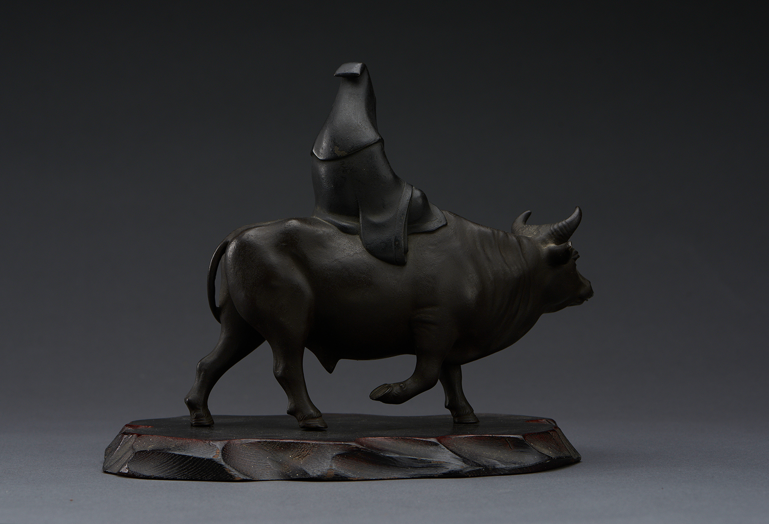 A Miyao school bronze of a Chinese sage in dark patinated bronze sits atop a large and muscular oxen. With wooden base, signed Koichi saku - Made by Koichi.