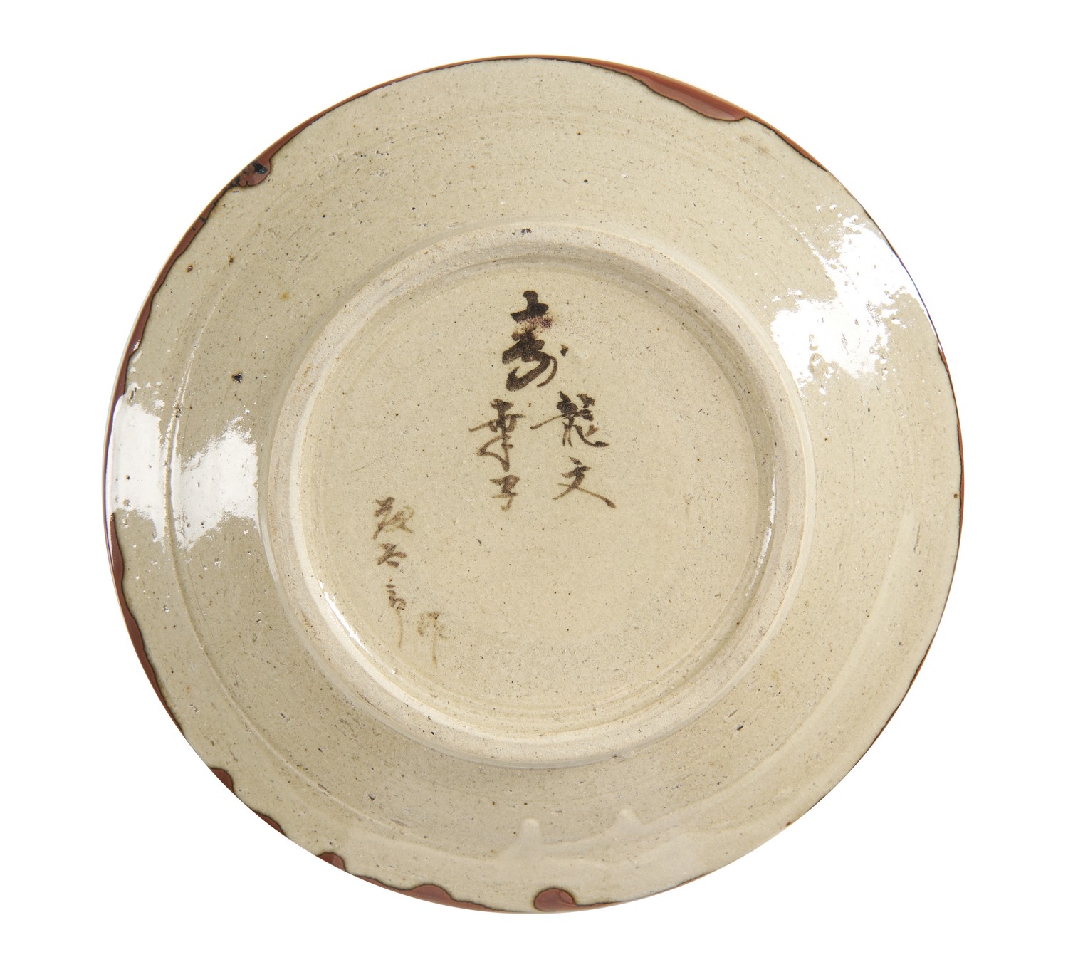 Decorated in iron (tetsuyu) and persimmon (kakiyu) glazes with an abstracted flower design. Inscription to the base in commemoration of a married couple and signed "Totaro saku". Together with tomobako (original signed wooden box) and an original exhibition pamphlet with comments on Totaro's pottery by Hamada Shoji..
