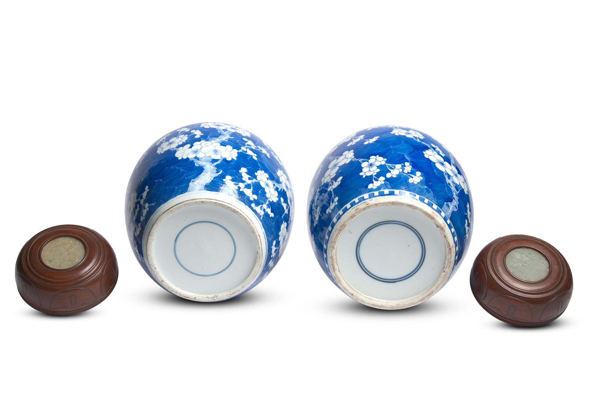 Both decorated with plum blossom against a blue ground, dating to late Kangxi through to early Qianlong Period. Together with carved hardwood lids inset with reticulated jade medallions and pierced hardwood stands.