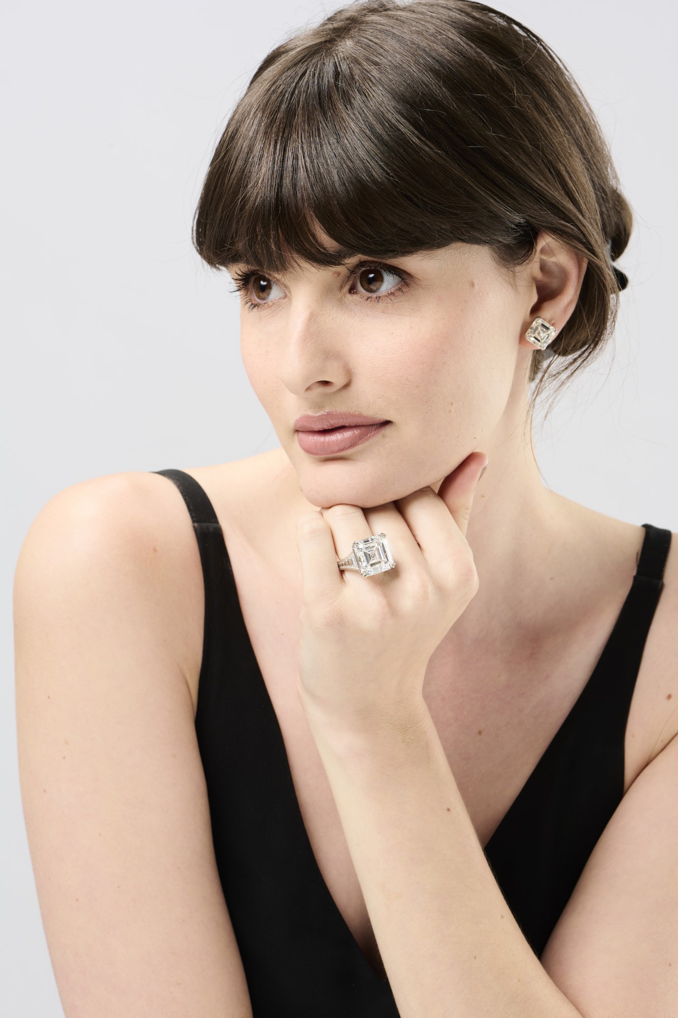 The square emerald-cut diamond weighing 25.02 carats is claw-set above a gallery pavé-set with brilliant-cut diamonds, between shoulders decorated with a line of graduating baguette diamonds, the small diamonds together weighing approximately 3.25 carats, size M.