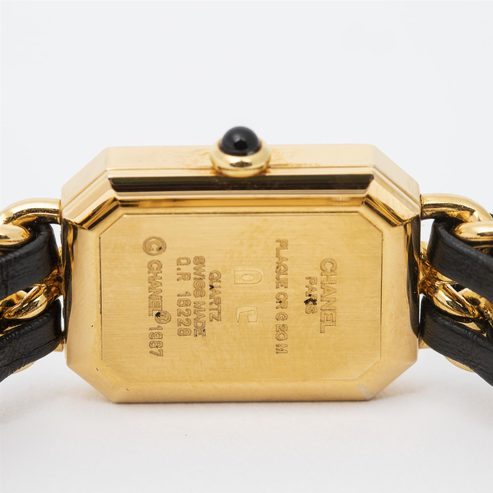 Quartz movement, rectangular black dial to a gold plated stainless steel case and conforming interlaced bracelet bands, total With interlaced stainless steal and leather bracelet, length 160mm, dial 20 x 25mm, reference number QR16228.