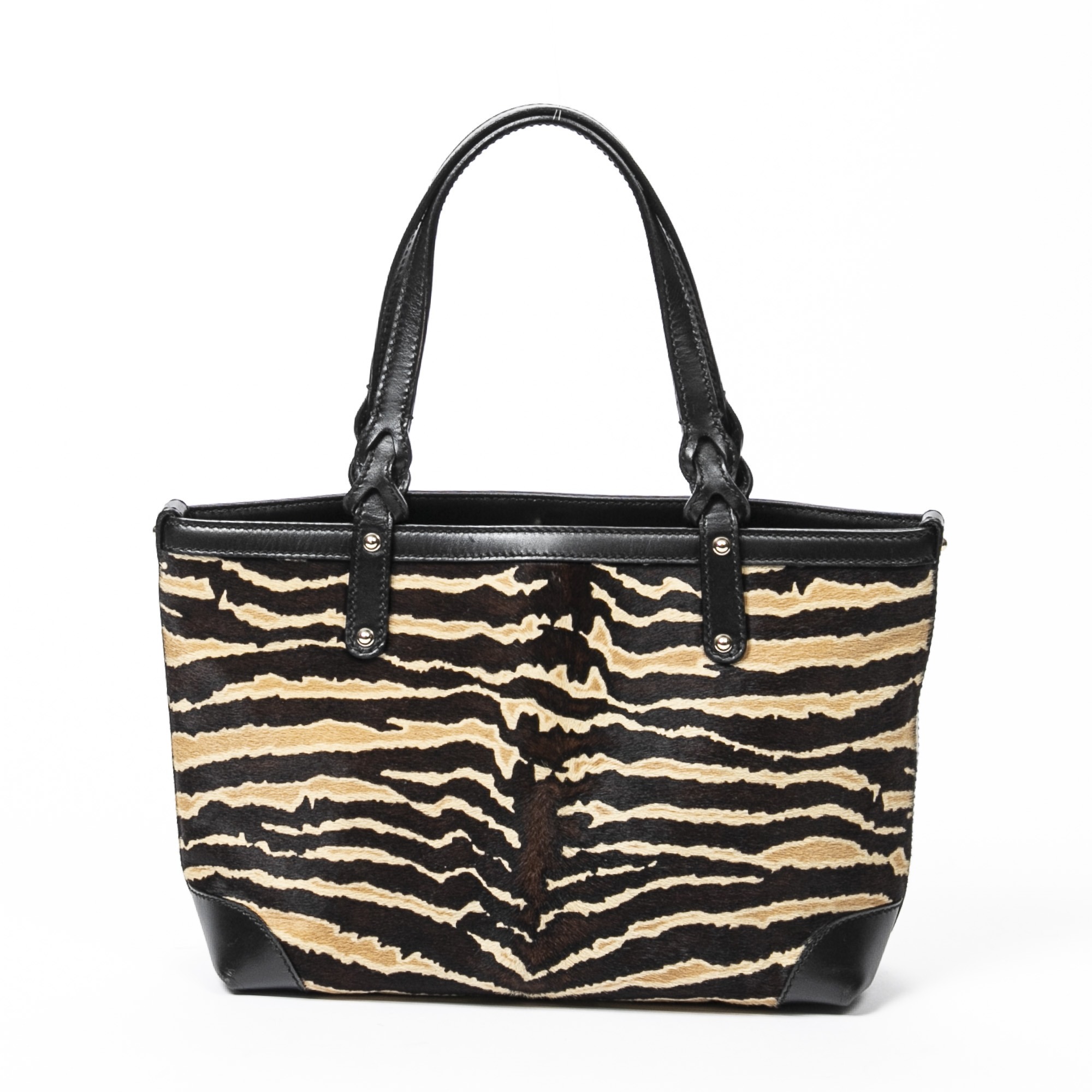 Styled in tiger striped pony hair with black leather trim, detachable inner purse, gold tone metal hardware, 27 x 20 x 10cm.