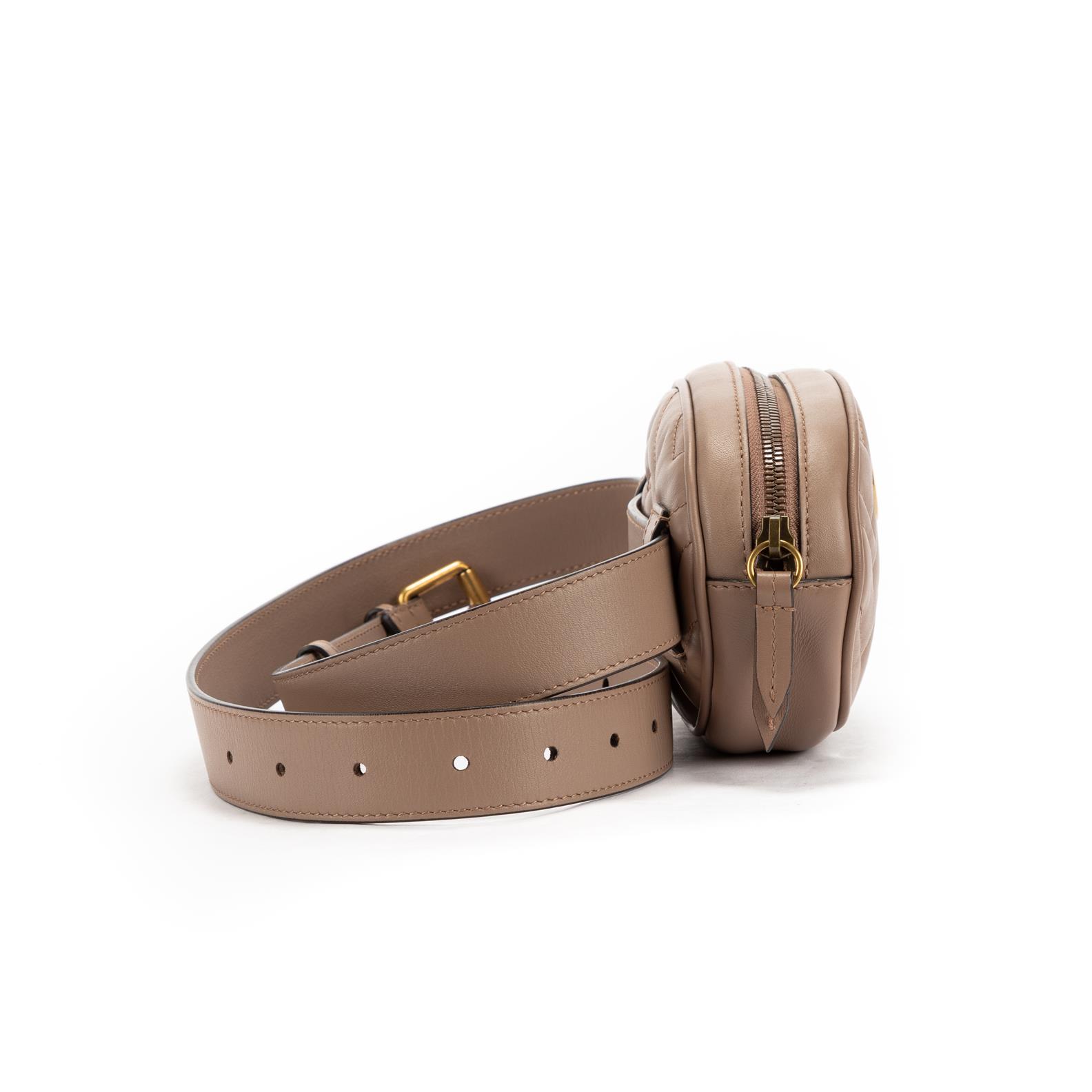 Styled in light pink leather with a light pink leather strap and gold hardware, 17 x 12 x 5cm.