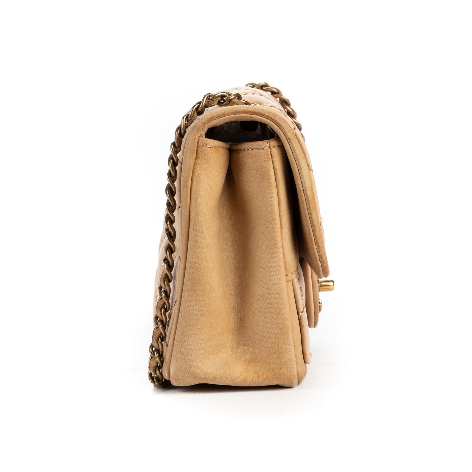 Styled in beige quilted leather with interlaced chain shoulder strap and gold tone metal hardware, 7 x 13 7.5cm.