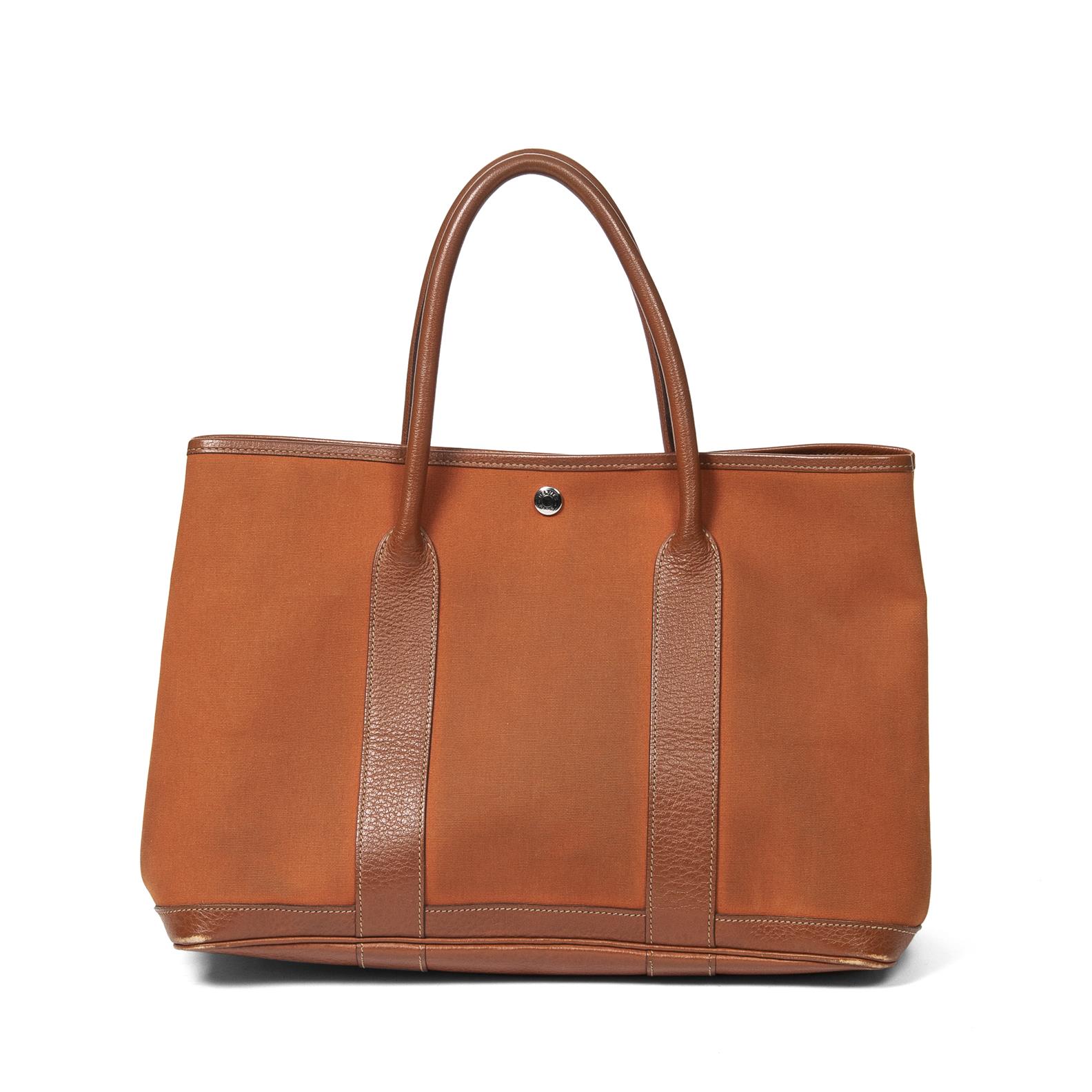 Styled in tan coated canvas with brown leather trim and silver tone hardware, 36.5 x 26 x 17.5cm.