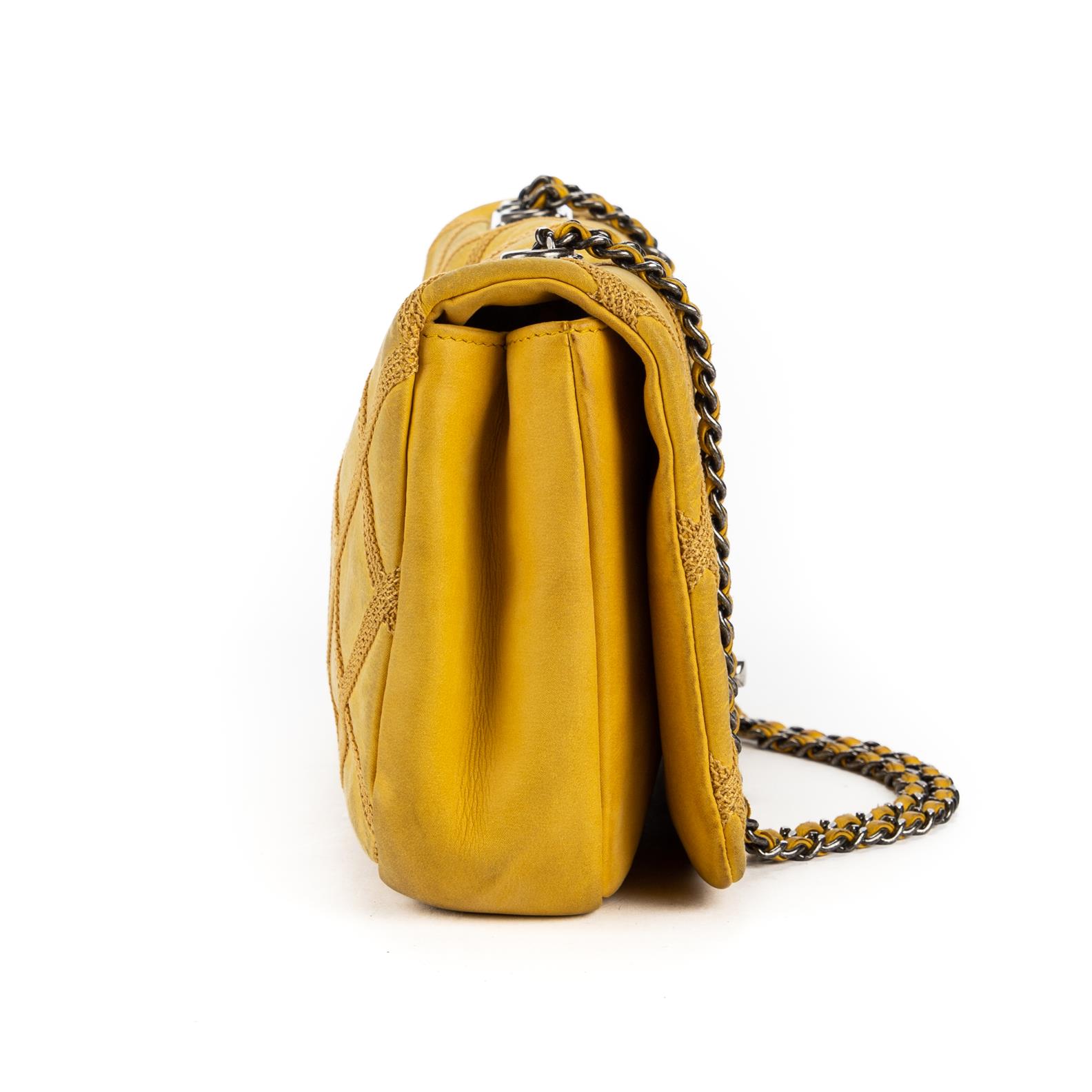 Styled in yellow quilted leather with interlaced chain shoulder strap and gunmetal tone metal hardware, 15 x 25 x 5cm