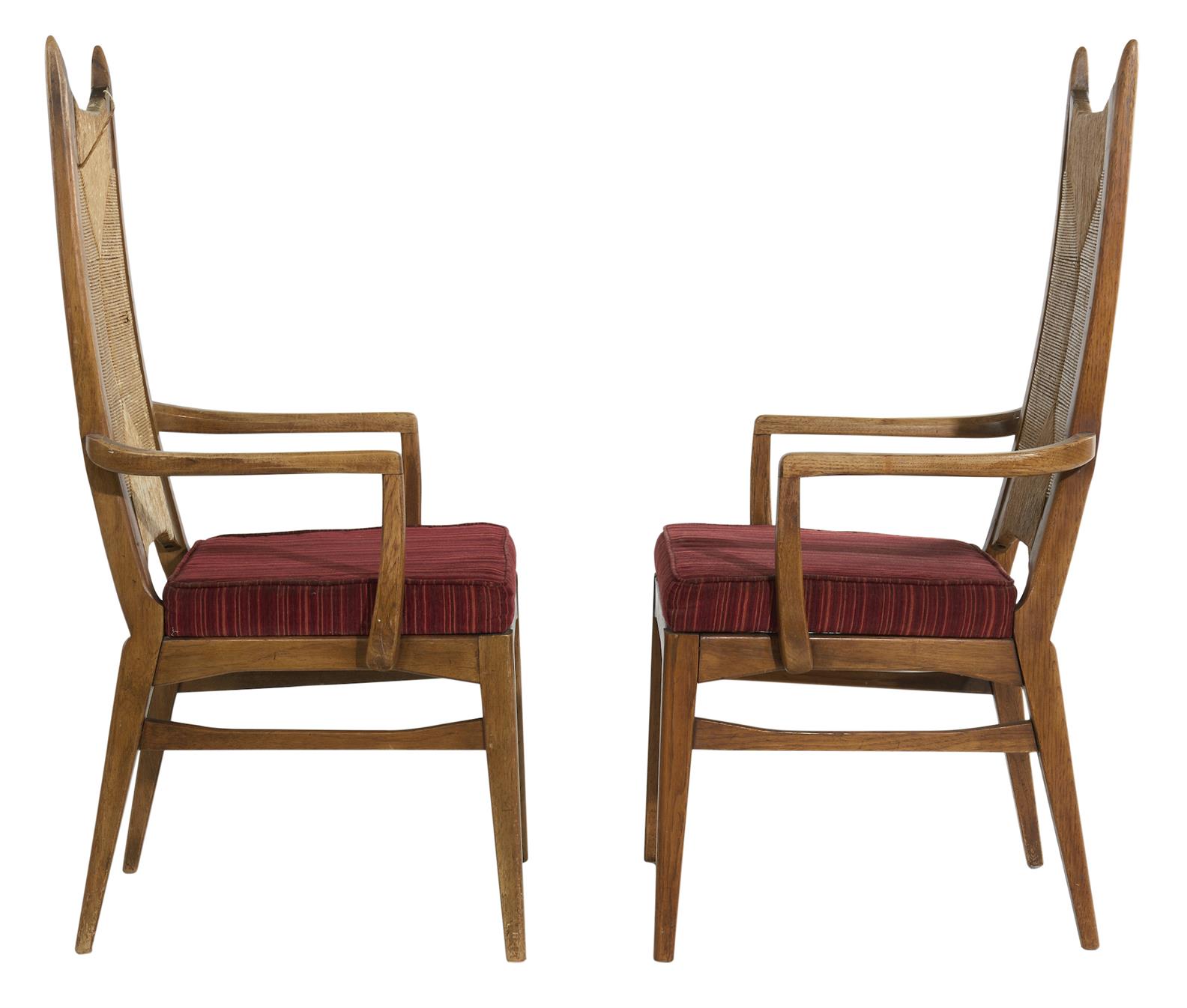 The rattan on each chair shows obvious signs of use for its age, minor cracking and damage to the arm of one of the chairs. The fabric is slighty faded consitent with age.