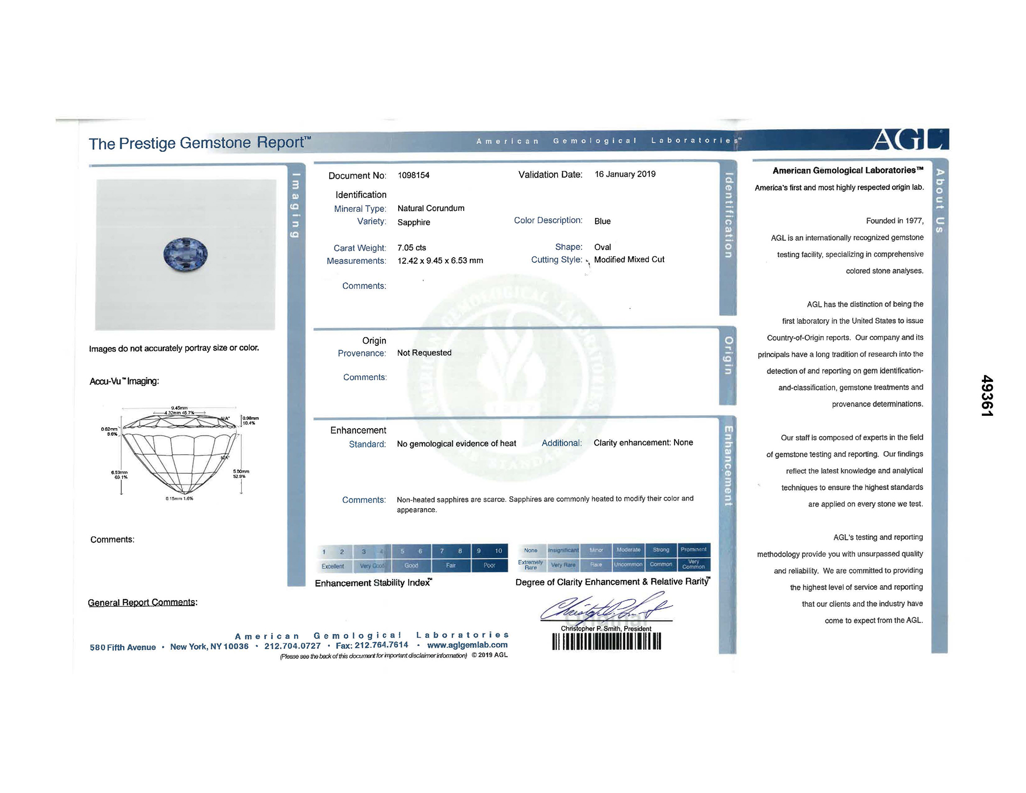 an AGL report numbered 1098154, dated 16 January 2019, stating that the 7.05 carat blue sapphire is natural, with no indications of heating;