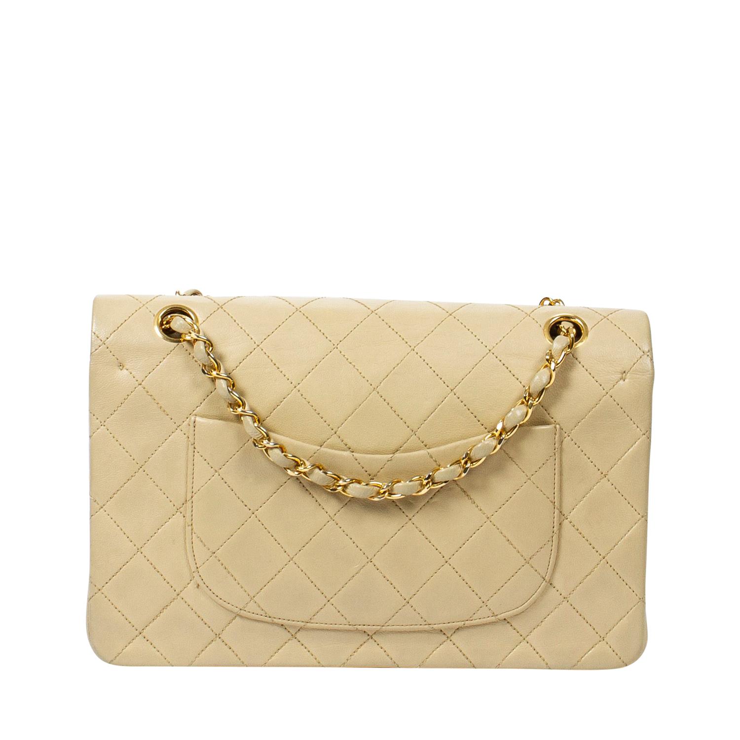 Styled in beige quilted lambskin leather with interlaced chain shoulder strap and gold tone metal hardware, 25 x 7 x 6.5m.