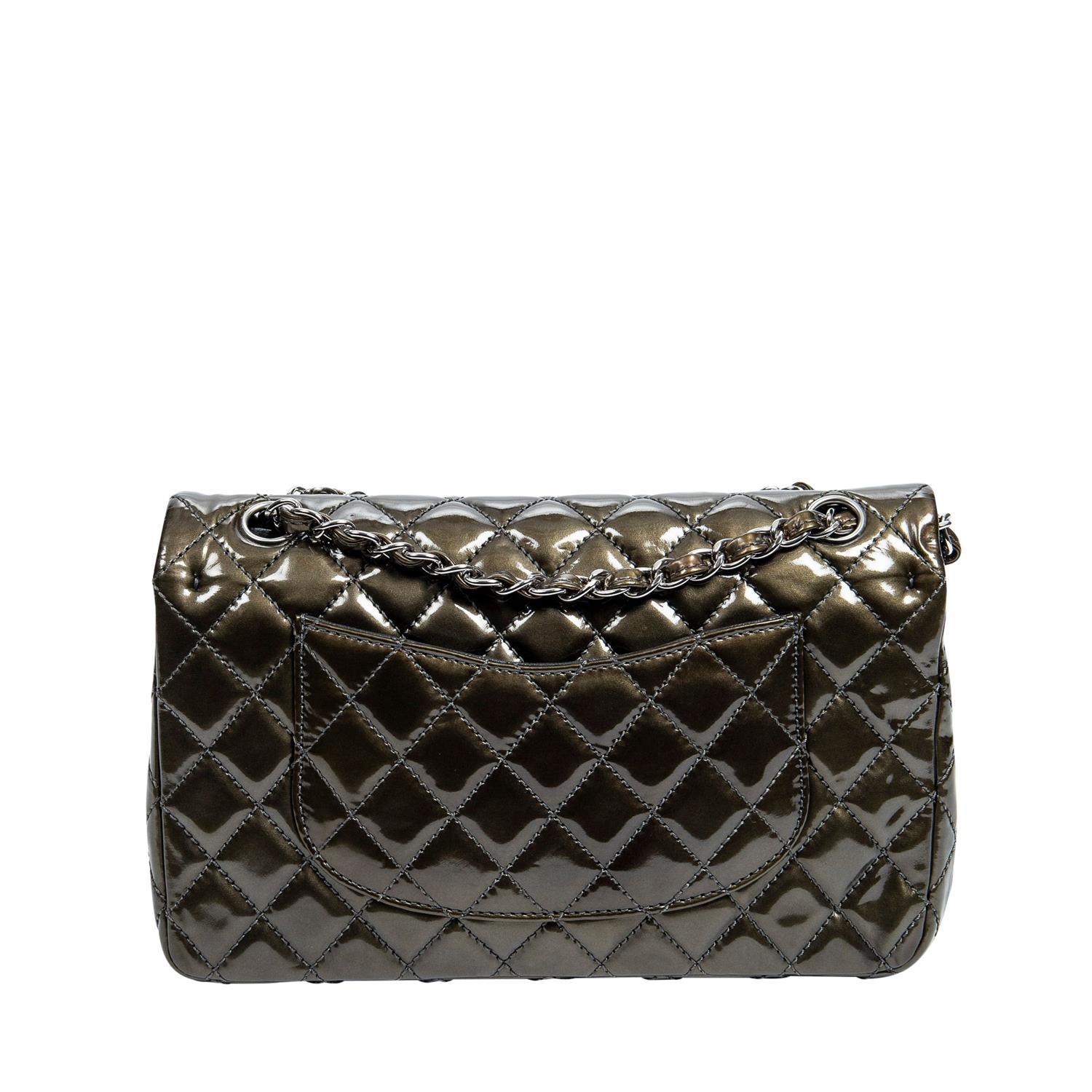 Styled in green quilted patent leather with interlaced chain shoulder strap and silver tone metal hardware, 26 x 15 x 7cm.