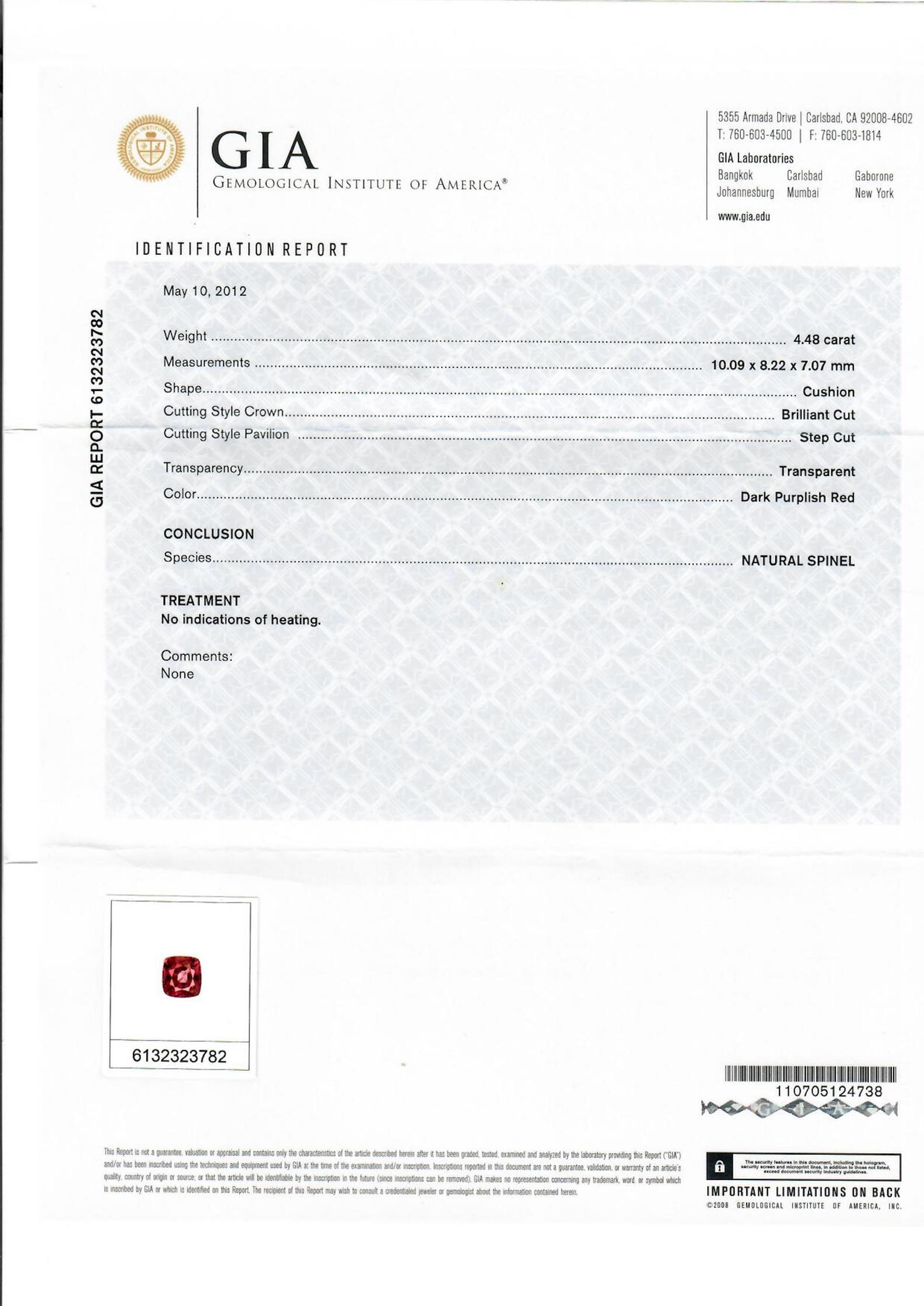 A SPINEL AND DIAMOND RING IN 18CT GOLD, OF OPEN DESIGN, TERMINATING IN A TENSION-SET CUSHION-CUT SPINEL WEIGHING 4.48 CARATS, AND A CLAW-SET BRILLIANT-CUT DIAMOND WEIGHING 2.99 CARATS WITHIN A FURTHER DIAMOND SURROUND, SIZE L, ACCOMPANIED BY GIA IDENTIFICATION REPORT NUMBER 6132323782 DATED 10TH MAY 2012, STATING THE 4.48 CARAT SPINEL HAS NO INDICATIONS OF HEATING