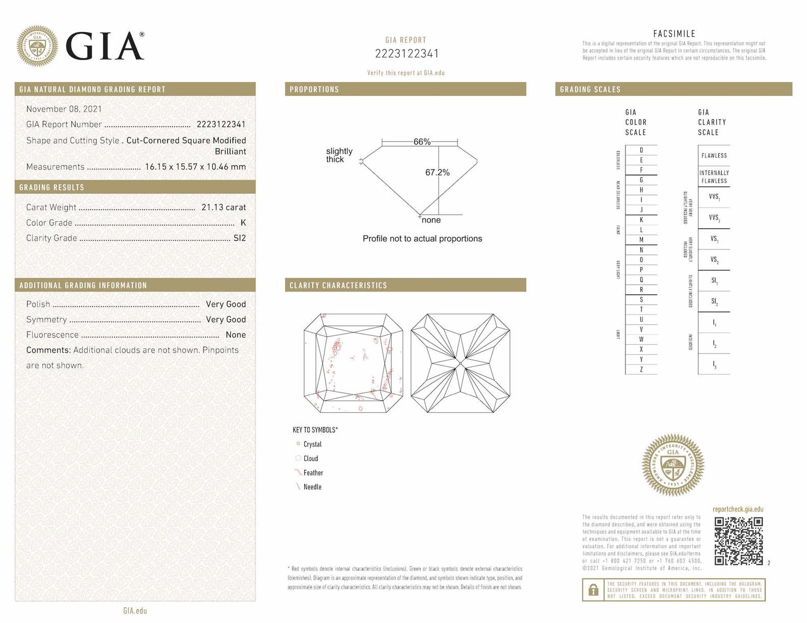 Accompanied by a GIA report numbered 2223122341, dated 8 November 2021, stating that the 21.13 carat diamond is natural, K colour, SI2 clarity.