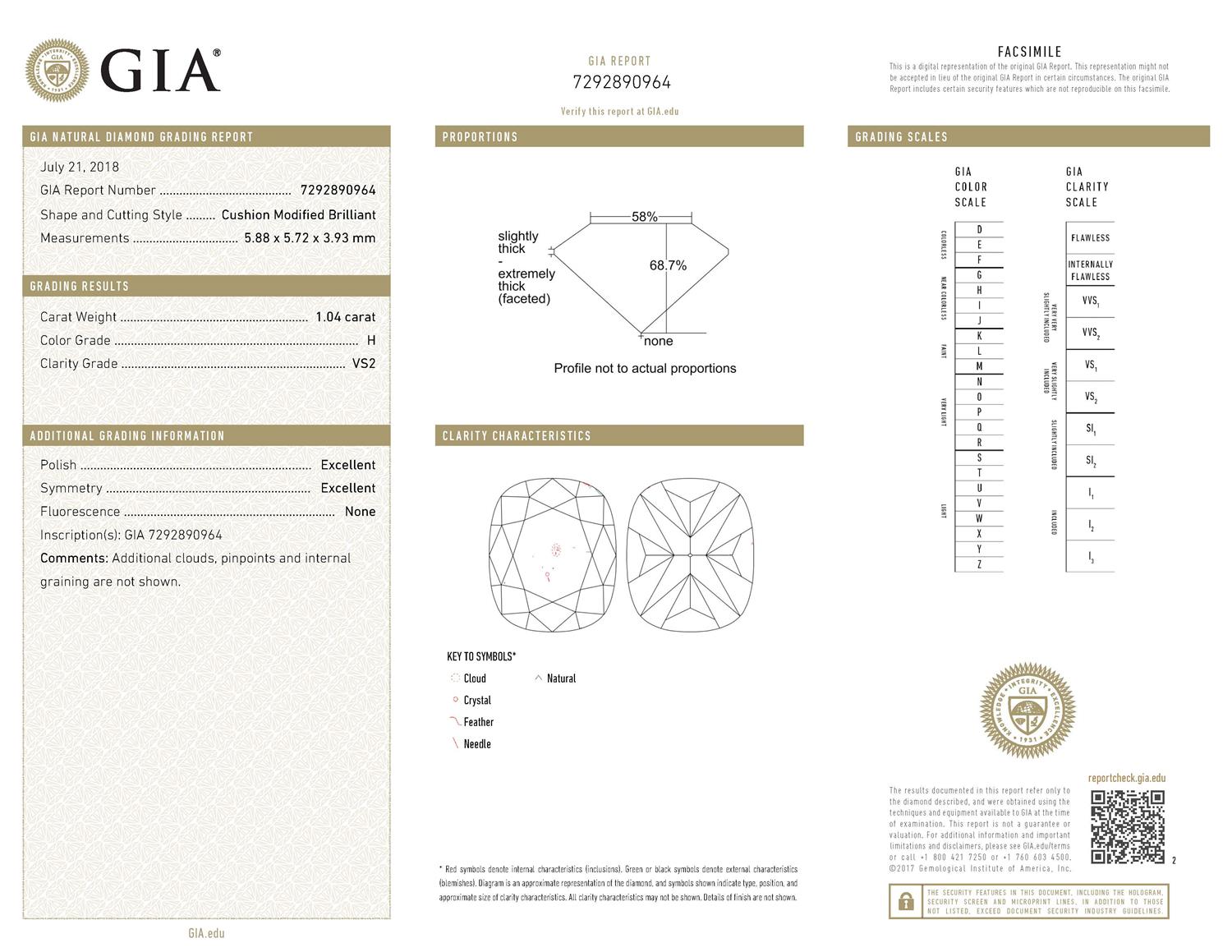Accompanied by a facsimile GIA report numbered 7292890964, dated 21 July 2018, stating that the 1.04 carat diamond is natural, H colour, VS2 clarity, laser inscribed.