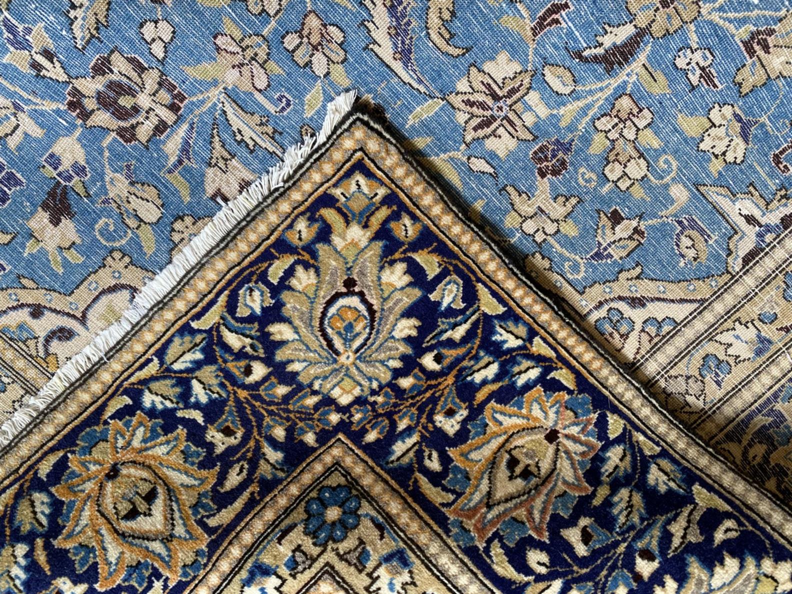 A PERSIAN QUM SHAHREZA SILK AND WOOL RUG. TRADITIONAL QUM DESIGN OF CENTRAL ANCHORED FLORAL MEDALLION AND QUARTERED CORNER MEDALLIONS, IN A FIELD OF BOLD PALMETTES, FLORAL MOTIFS AND TENDRILS. BORDER OF PALMETTES AND FLORAL SPRAYS. THE ENTIRE IN HUES OF MIDNIGHT BLUE, INDIGO, CREAM AND BEIGE. GALLERY EXHIBITED, IN PRISTINE CONDITION. CERTIFICATE OF AUTHENTICITY & ORIGIN ON REQUEST. ORIGIN: IRAN (330 X 230 CM) (PLEASE NOTE THERE MAY BE SOME COLOUR VARIATION FROM PHOTOGRAPH)