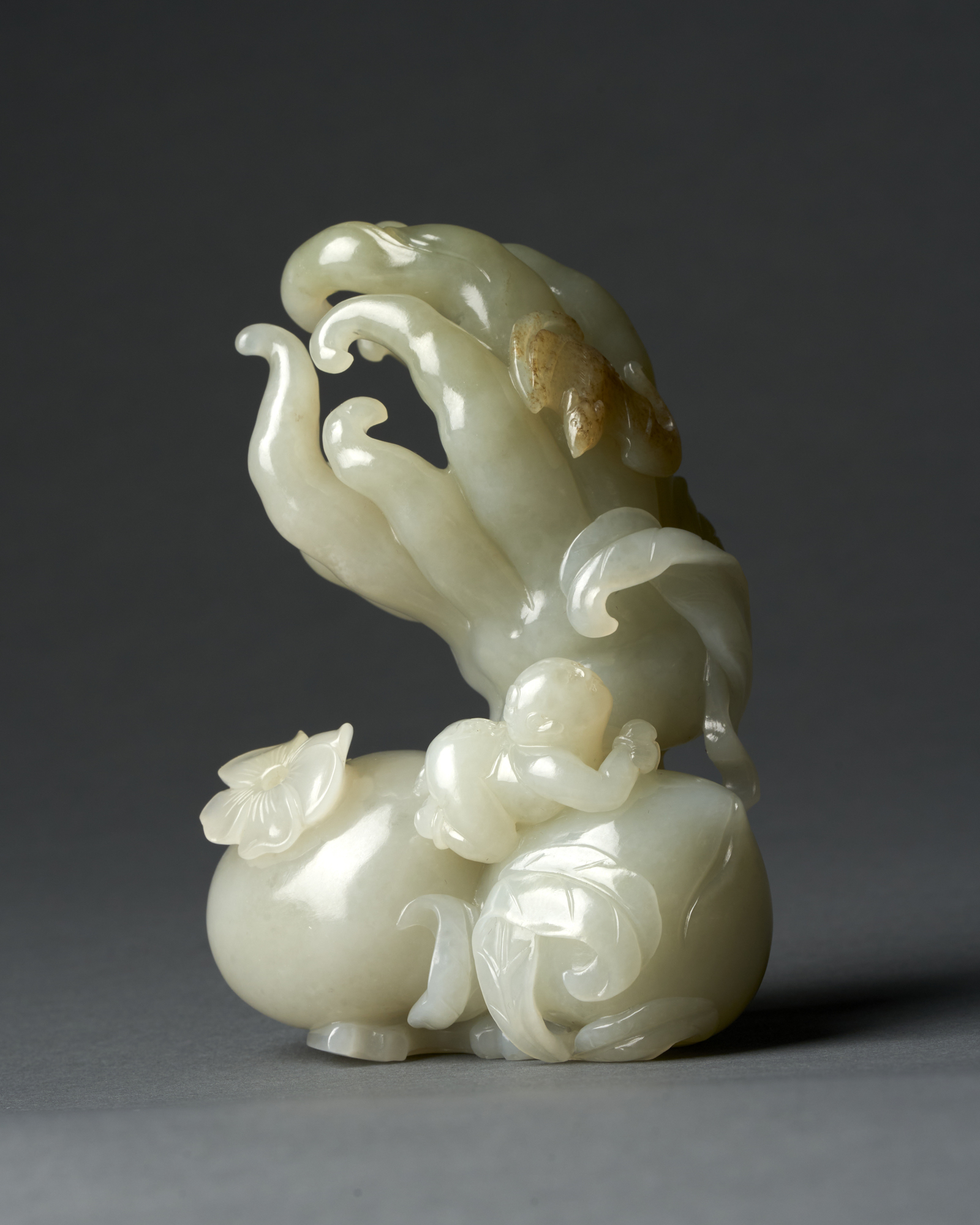 Finely carved with a Buddha's hand citron and a bat, alongside a pomegranate and a peach, with a small boy playfully resting atop the fruits.