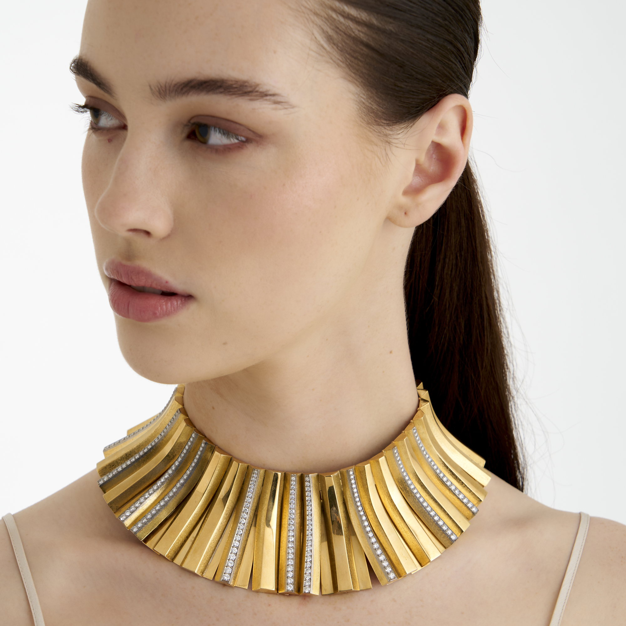 Comprised of a series of articulated curved panels, ten of the panels detailed with graduating claw-set round brilliant-cut diamonds, the diamonds together weighing approximately 6.50 carats, completed by a concealed tongue and groove clasp, inner circumference 340mm, gross weight approximately 316.0 grams.