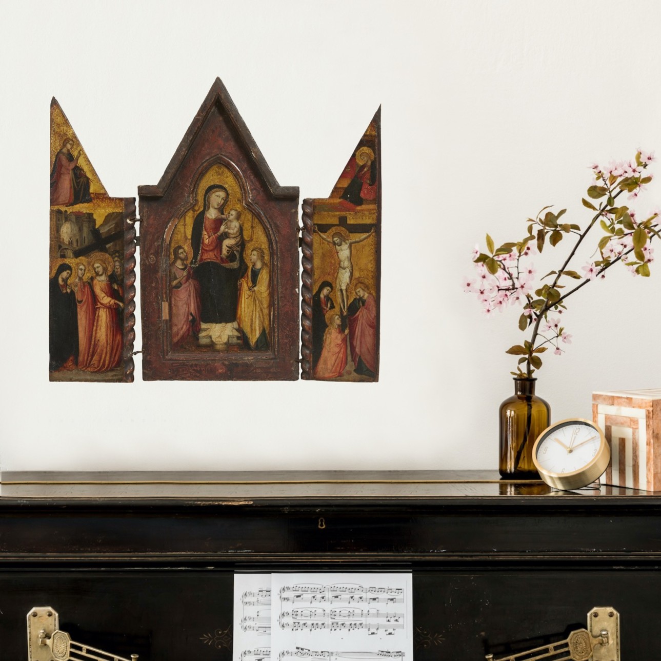 The central panel: the Madonna and Child enthroned and flanked by two angels; the left wing: Christ on the Road to Calvary with the Madonna and Saint John, with The Annunciate Angel above; the right wing: The Crucifixion, with The Virgin Annunciate above
