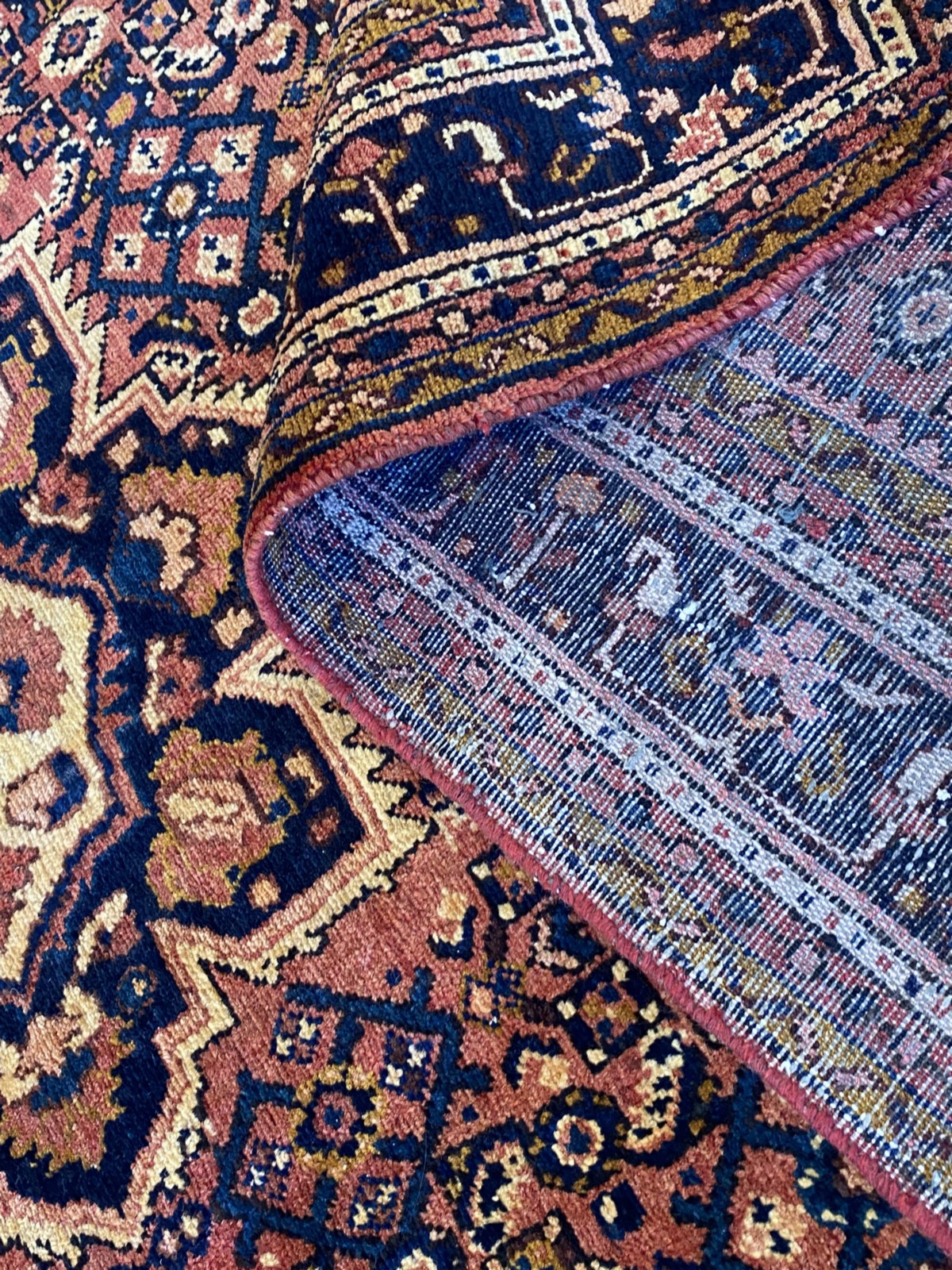 HAND-KNOTTED VILLAGE WEAVE FROM THE HAMADAN PROVINCE WITH TRIBAL DESIGN OF CENTRAL FLORAL MEDALLION IN A FIELD OF BOLD HERATI MAHI PATTERNS.