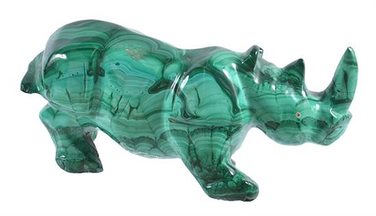 A COLLECTION OF OBJECTS, including stone teapot, malachite rhinoceros, soapstone seal, soapstone bird group, glass tea set and two glass elephants. The rhinoceros 6cm x 16cm, restored