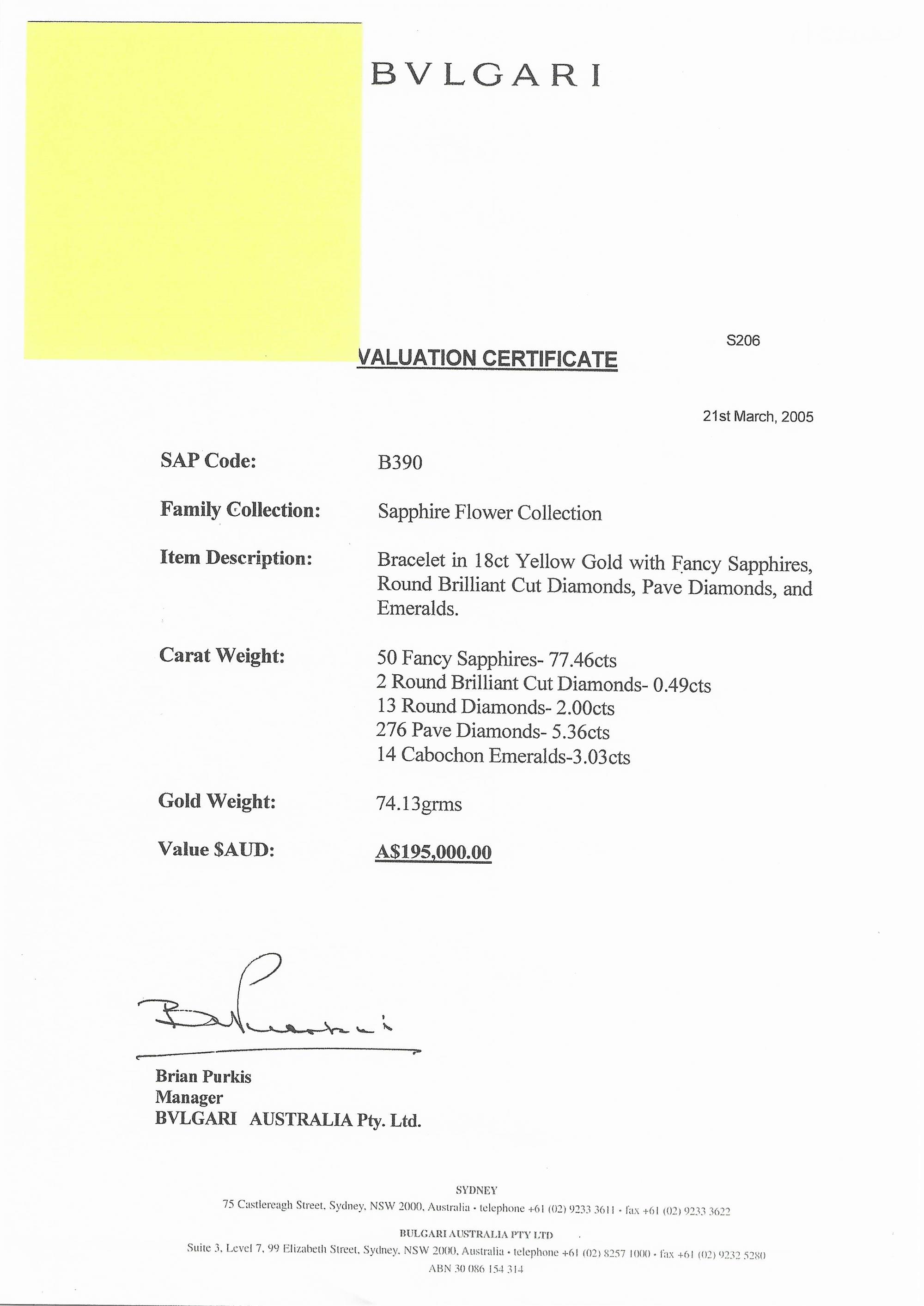 Modelled as a wide strap comprising of lines of flower heads each centring a brilliant-cut diamond stamen within a surround of petals claw-set with variously coloured pear-shaped sapphires framed by symmetrical openwork annular motifs, pavé-set with brilliant-cut diamonds decorated at intervals with articulated claw-set diamonds and circular-cut emeralds, completed by a similarly set box clasp, the sapphires, emeralds and diamonds together stated to weigh 77.46 carats, 3.03 carats, and 7.36 carats respectively, length approximately 185mm, signed Bulgari.