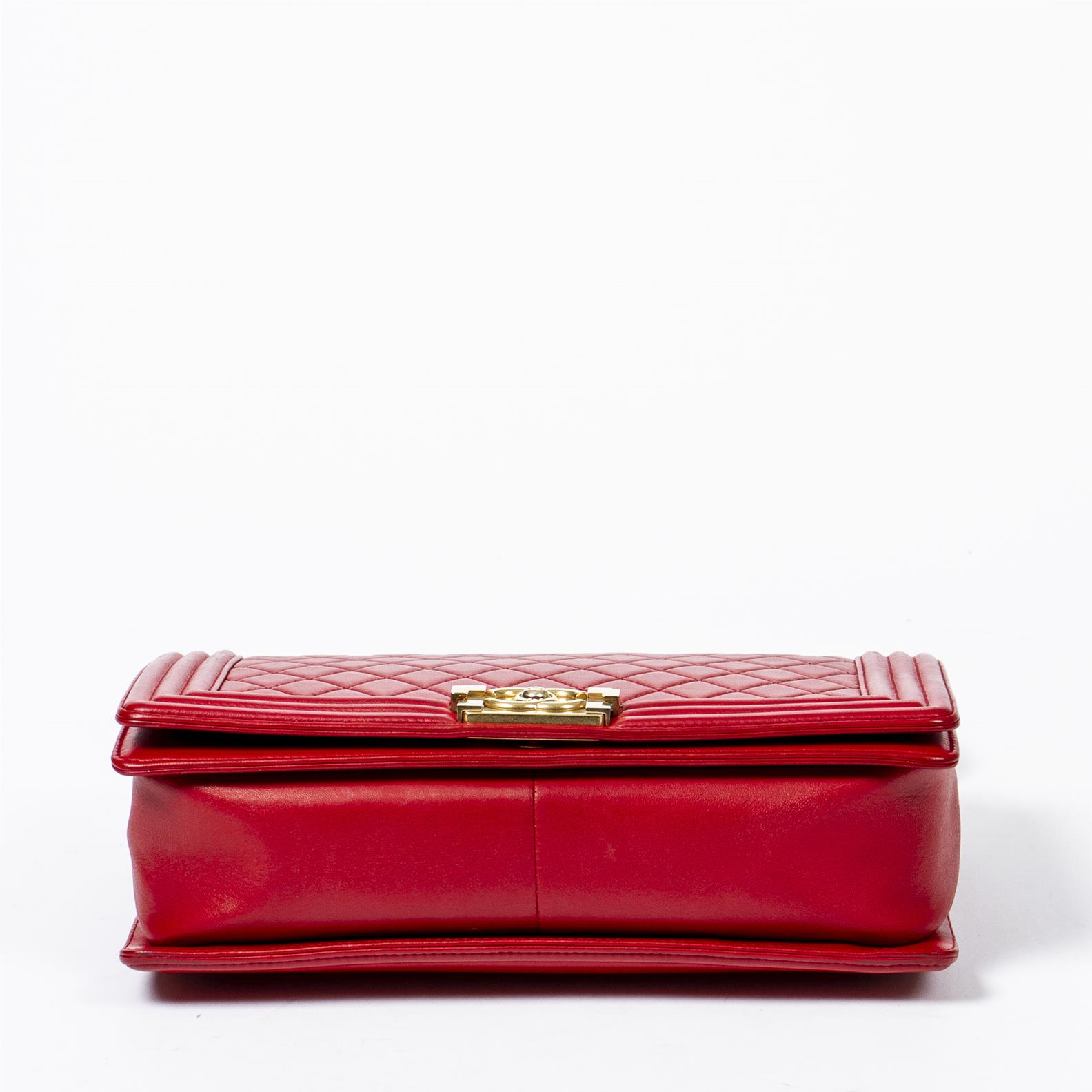 Styled in red quilted leather with chain and leather strap and gold tone metal hardware, 28 x 18 x 9cm.