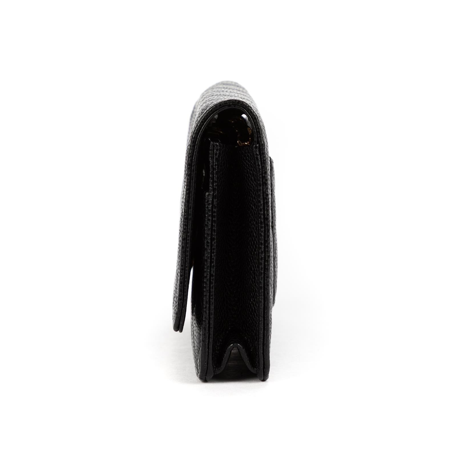 Styled in black quilted leather with interlaced chain shoulder strap and gold tone metal hardware, 19 x 12 x 4cm.