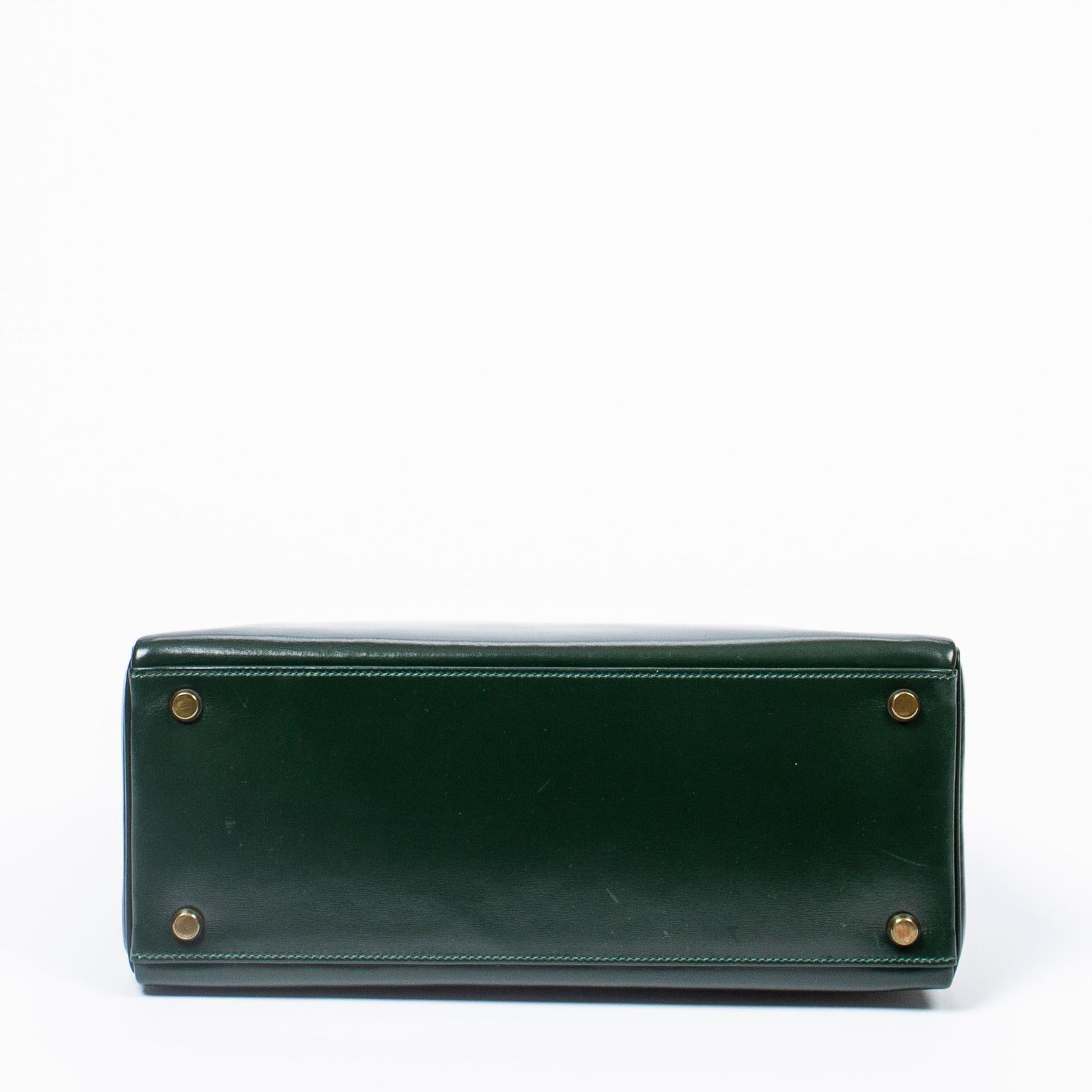 Styled in dark green box leather and gold tone hardware, 28 x 22 x 11cm.