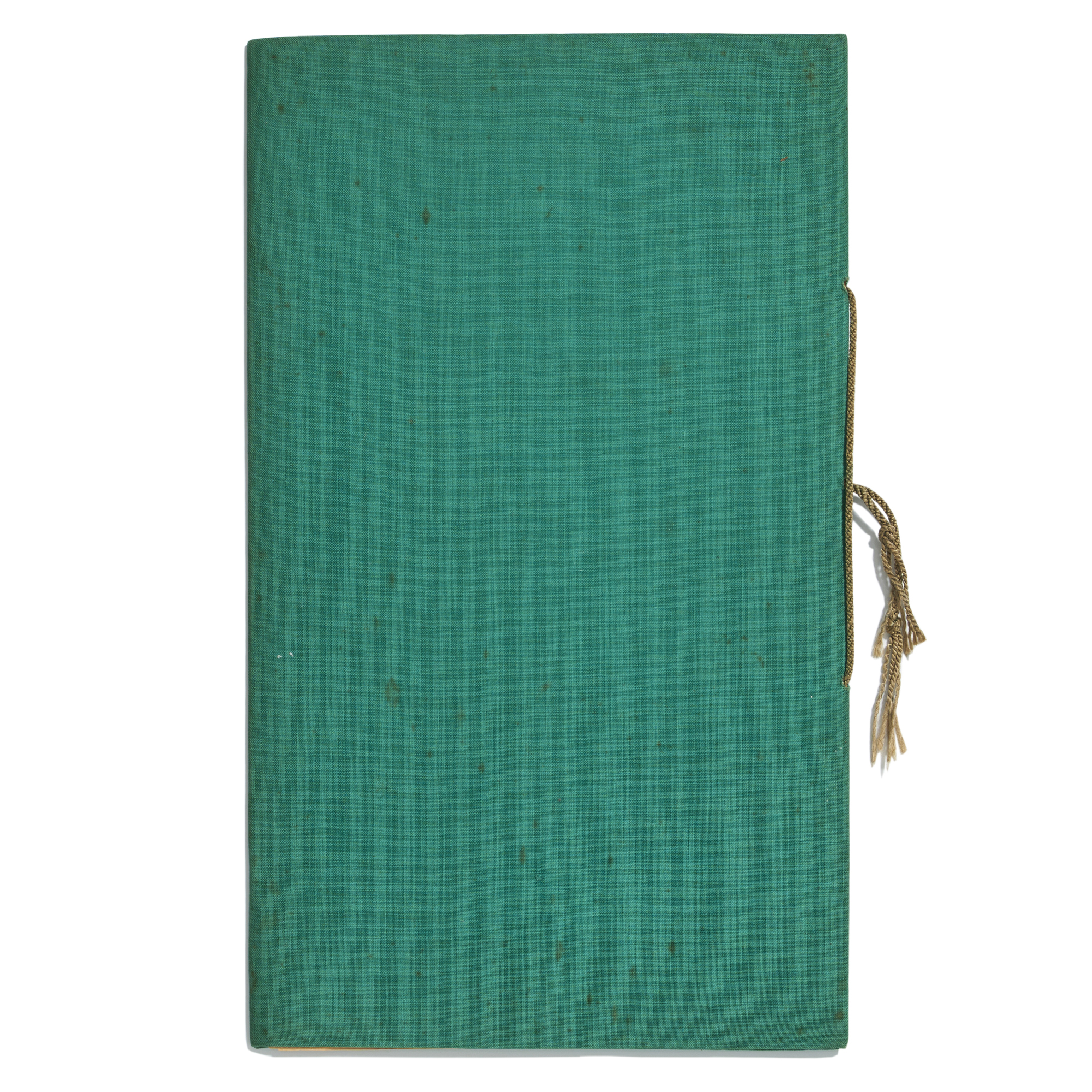 in the original three-fold portfolio covered in green fabric with gold paint additions, bound with green and gold cord