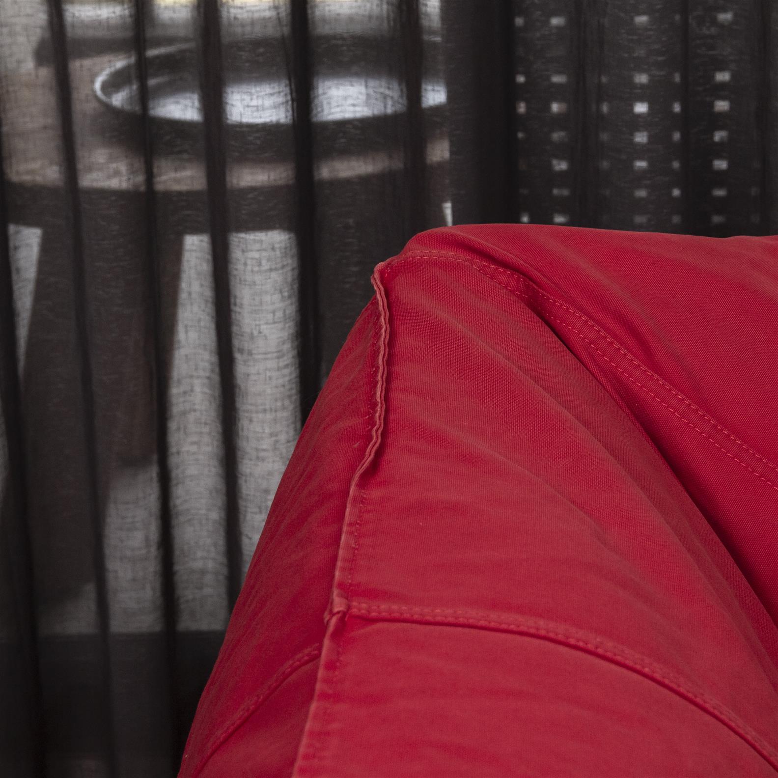 Featuring a two seat sofa in brown leather and an interchangeable red fabric cover.