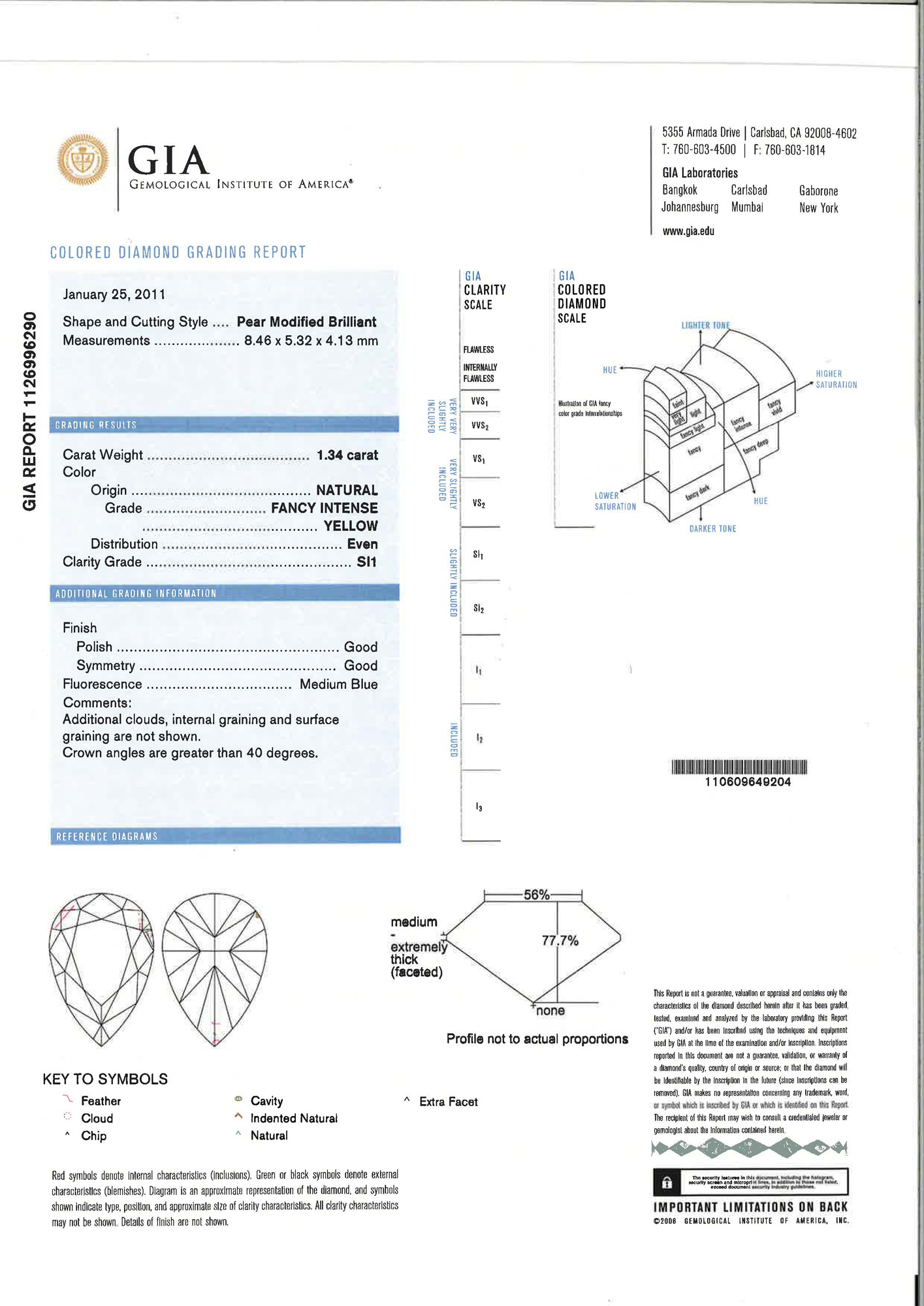 a fascimile GIA report numbered 1126996290 dated 25 January 2011, stating that the 1.34 carat diamond is natural fancy intense yellow colour, SI1 clarity;