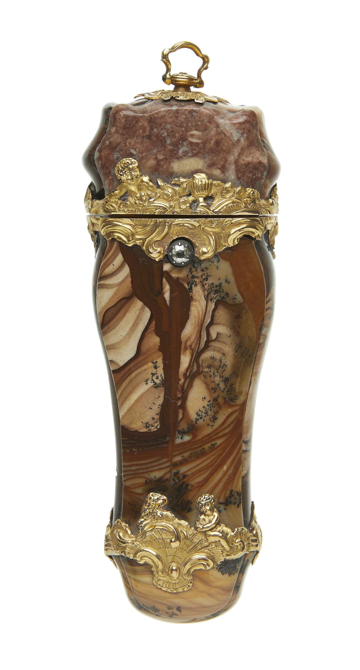The hinged top with applied frieze depicting a reclining putti nestled amongst foliate border, opening to reveal a collection of small implements, the shaped mottled cream and brown agate body with applied gilding to the base. Old cut diamond set thumb piece.