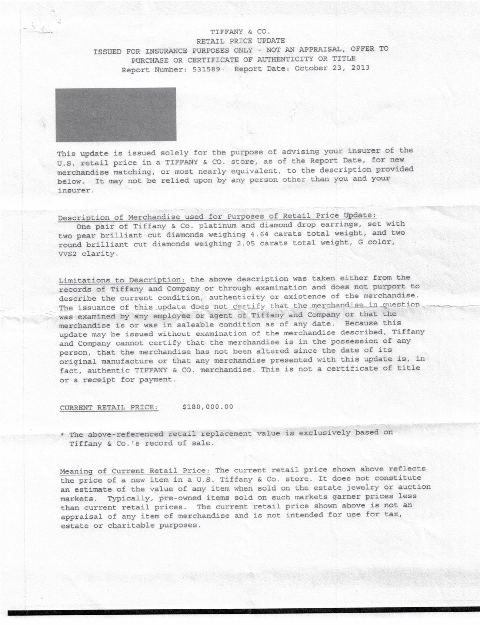 Accompanied by Tiffany & Co. facsimile Insurance Valuation, report number 531589, dated 23 October 2013, and box.