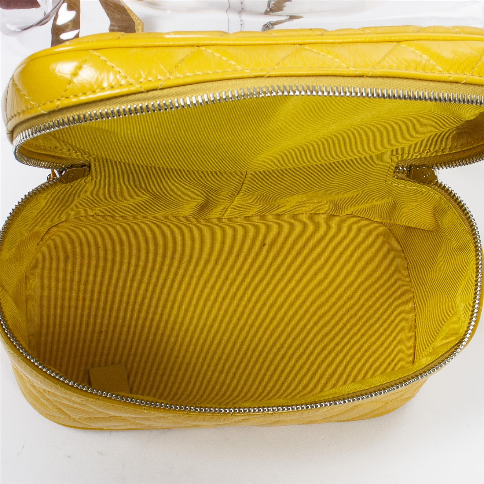 Styled in yellow quilted leather and clear pvc with interlaced chain and silver tone hardware, 21 x 24 x 11cm.